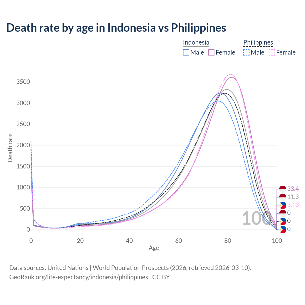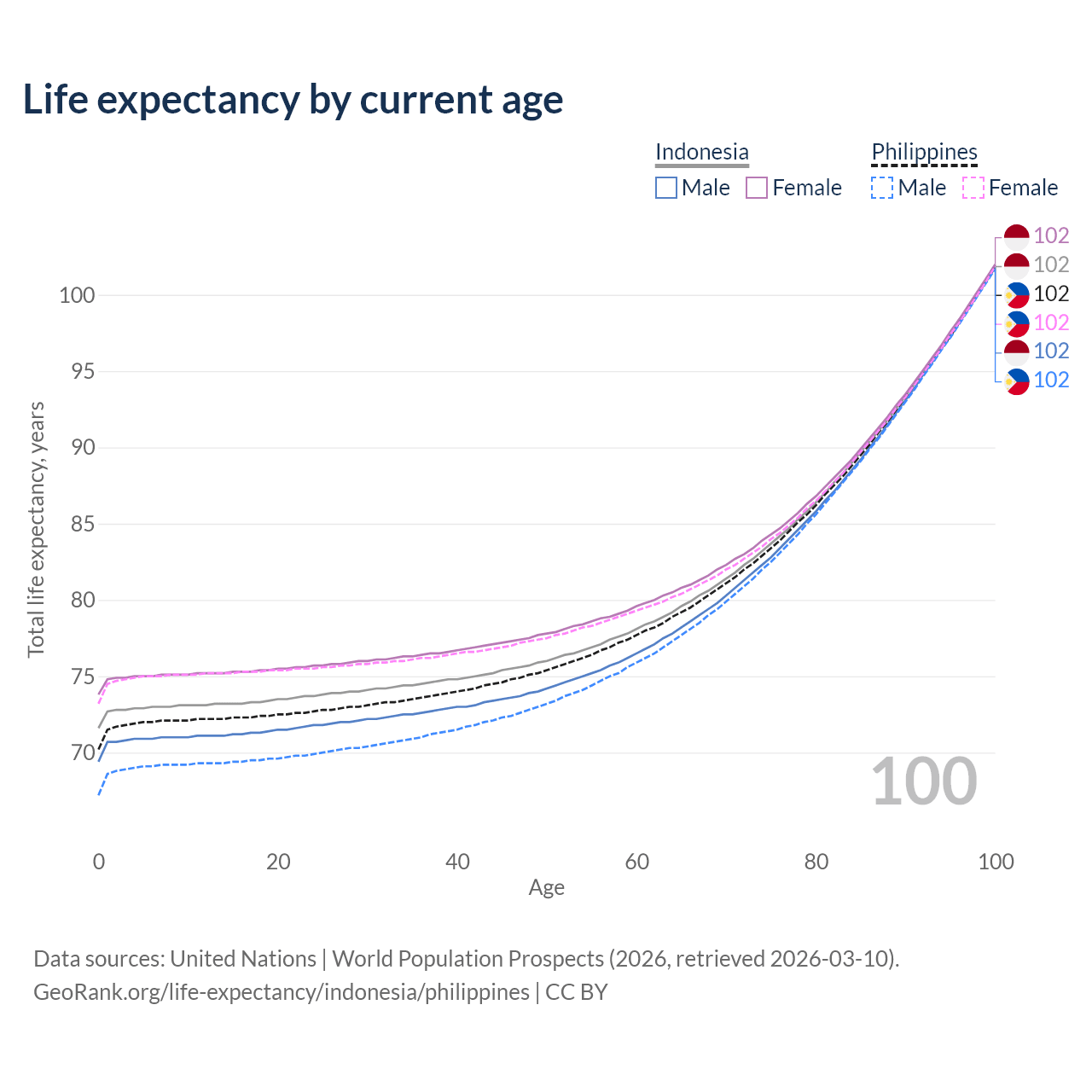 This life expectancy calculator shows the odds of living to 100, 95, 90, and below based on current age for both males and females in Indonesia and the Philippines, along with mean and median age of death. The calculations are based on the 2026 life tables (actuarial tables) from the UN World Population Prospects.