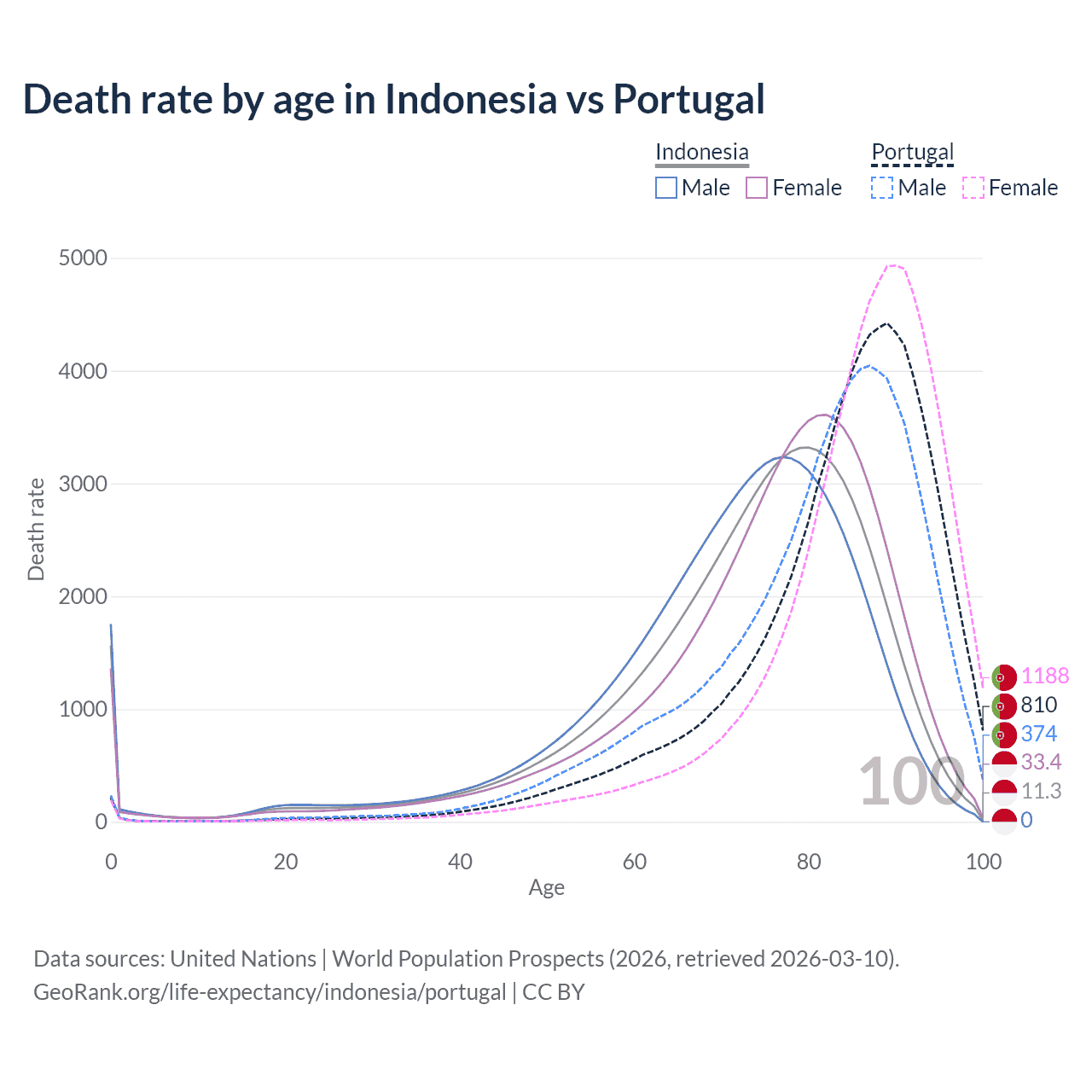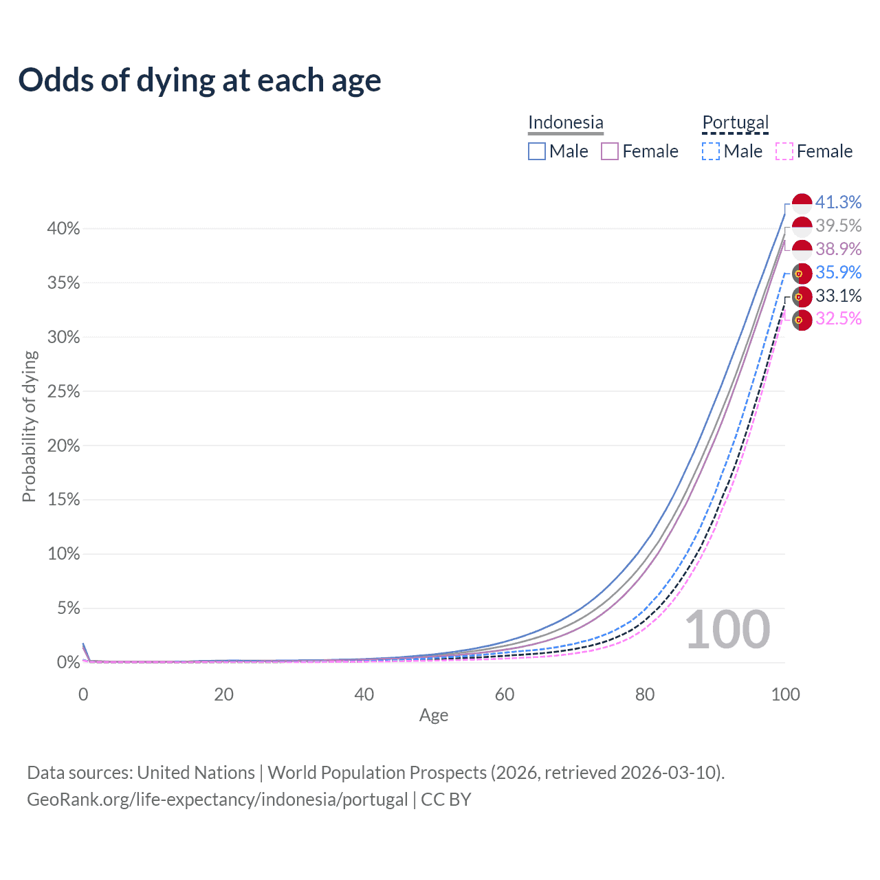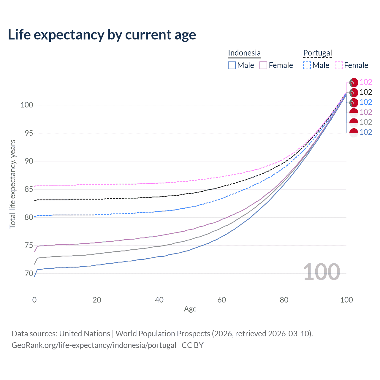 This life expectancy calculator shows the odds of living to 100, 95, 90, and below based on current age for both males and females in Indonesia and Portugal, along with mean and median age of death. The calculations are based on the 2026 life tables (actuarial tables) from the UN World Population Prospects.