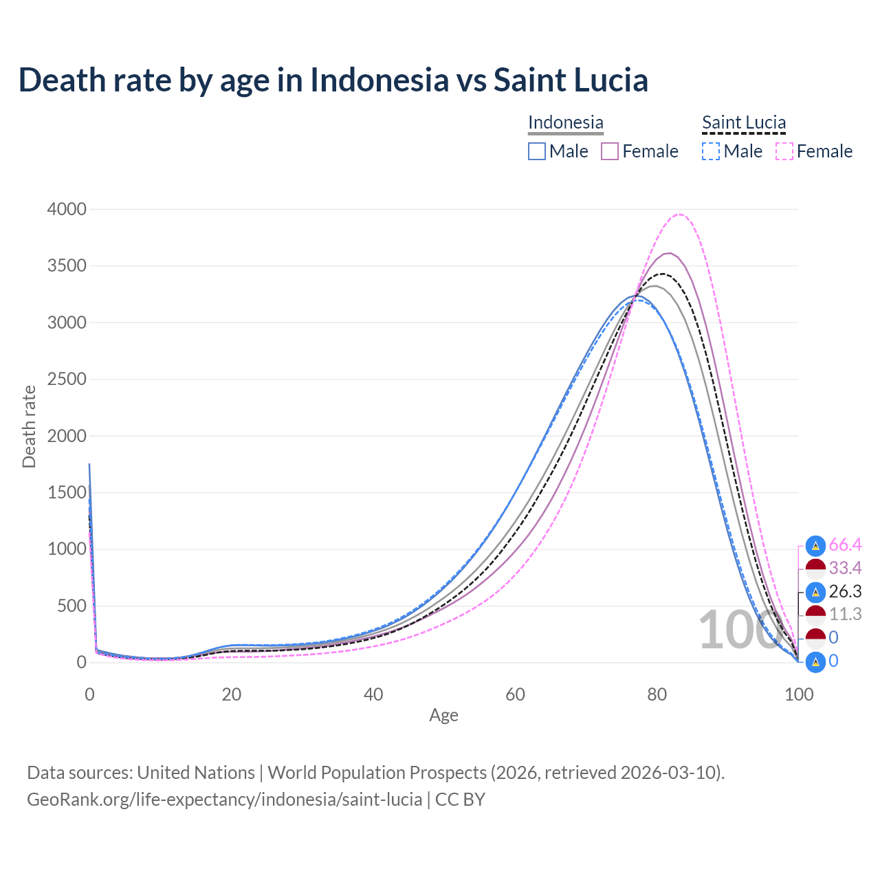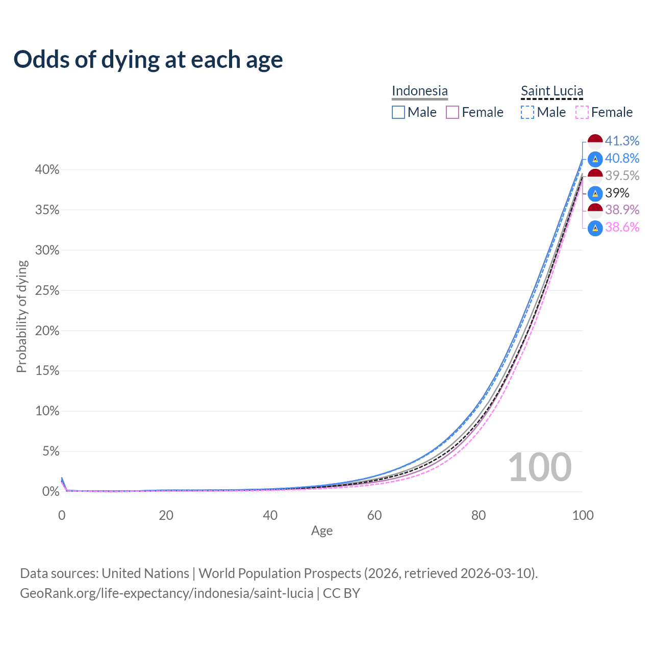 This life expectancy calculator shows the odds of living to 100, 95, 90, and below based on current age for both males and females in Indonesia and Saint Lucia, along with mean and median age of death. The calculations are based on the 2026 life tables (actuarial tables) from the UN World Population Prospects.