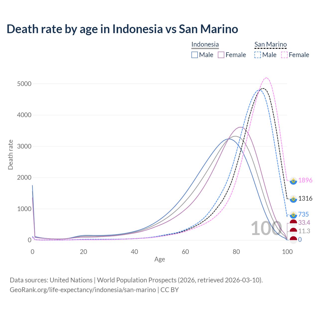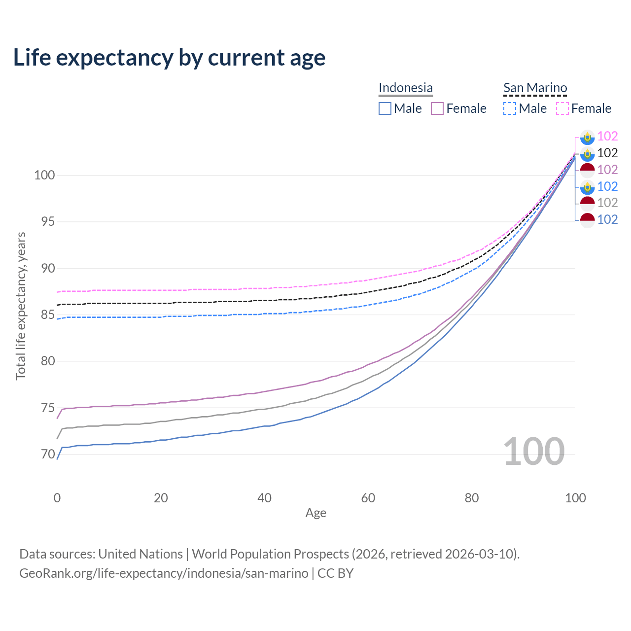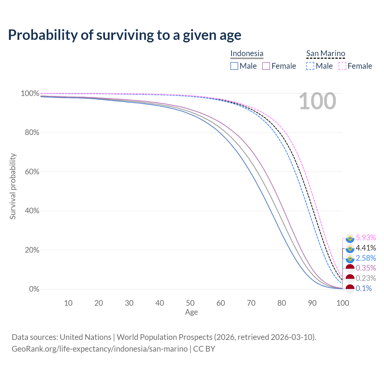 This life expectancy calculator shows the odds of living to 100, 95, 90, and below based on current age for both males and females in Indonesia and San Marino, along with mean and median age of death. The calculations are based on the 2026 life tables (actuarial tables) from the UN World Population Prospects.