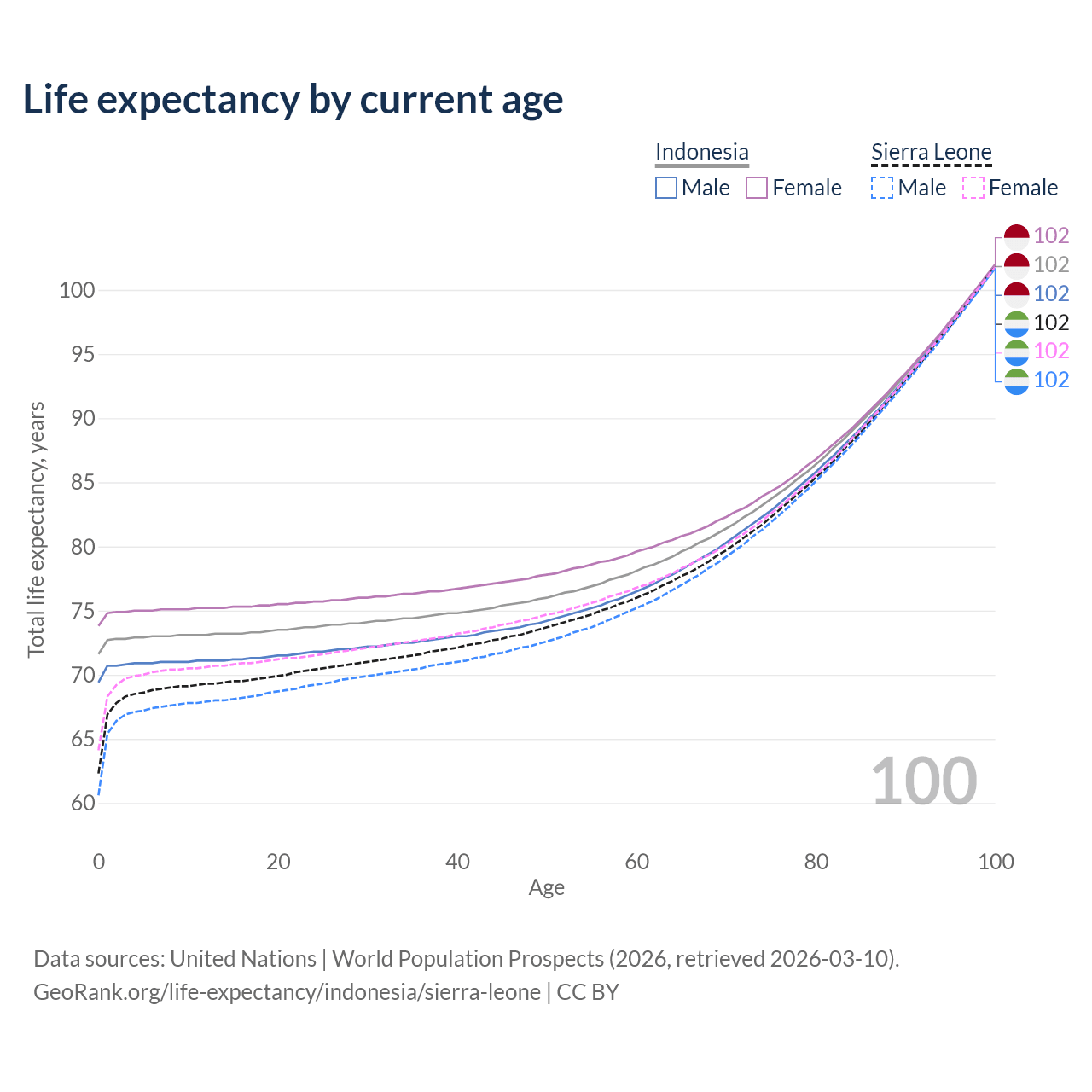 This life expectancy calculator shows the odds of living to 100, 95, 90, and below based on current age for both males and females in Indonesia and Sierra Leone, along with mean and median age of death. The calculations are based on the 2026 life tables (actuarial tables) from the UN World Population Prospects.