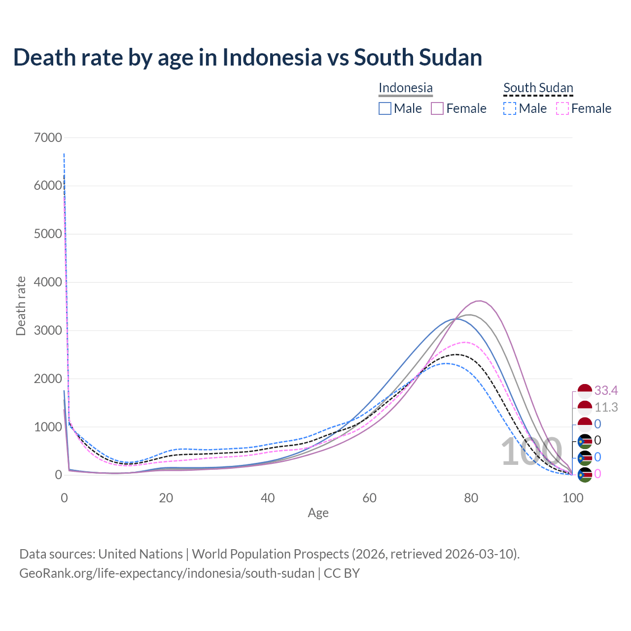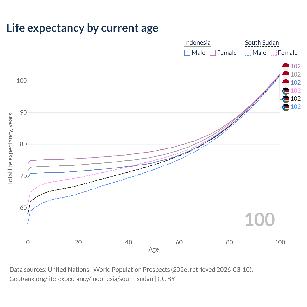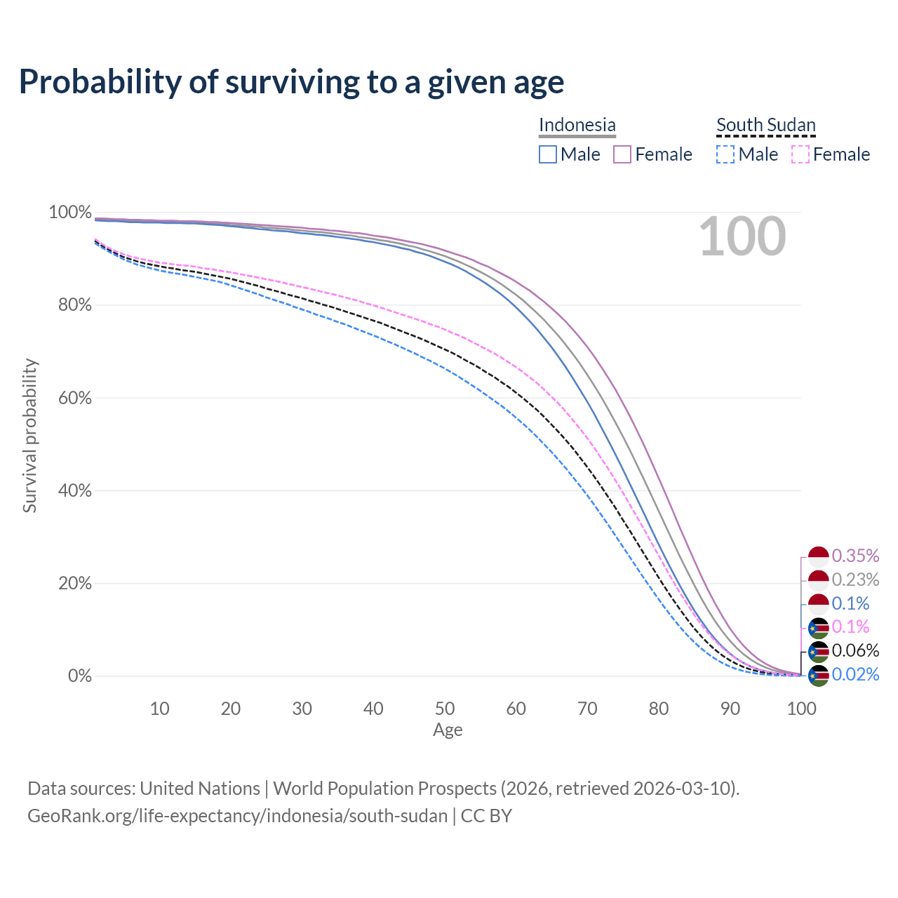 This life expectancy calculator shows the odds of living to 100, 95, 90, and below based on current age for both males and females in Indonesia and South Sudan, along with mean and median age of death. The calculations are based on the 2026 life tables (actuarial tables) from the UN World Population Prospects.