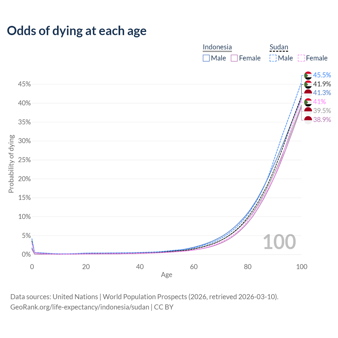 This life expectancy calculator shows the odds of living to 100, 95, 90, and below based on current age for both males and females in Indonesia and Sudan, along with mean and median age of death. The calculations are based on the 2026 life tables (actuarial tables) from the UN World Population Prospects.