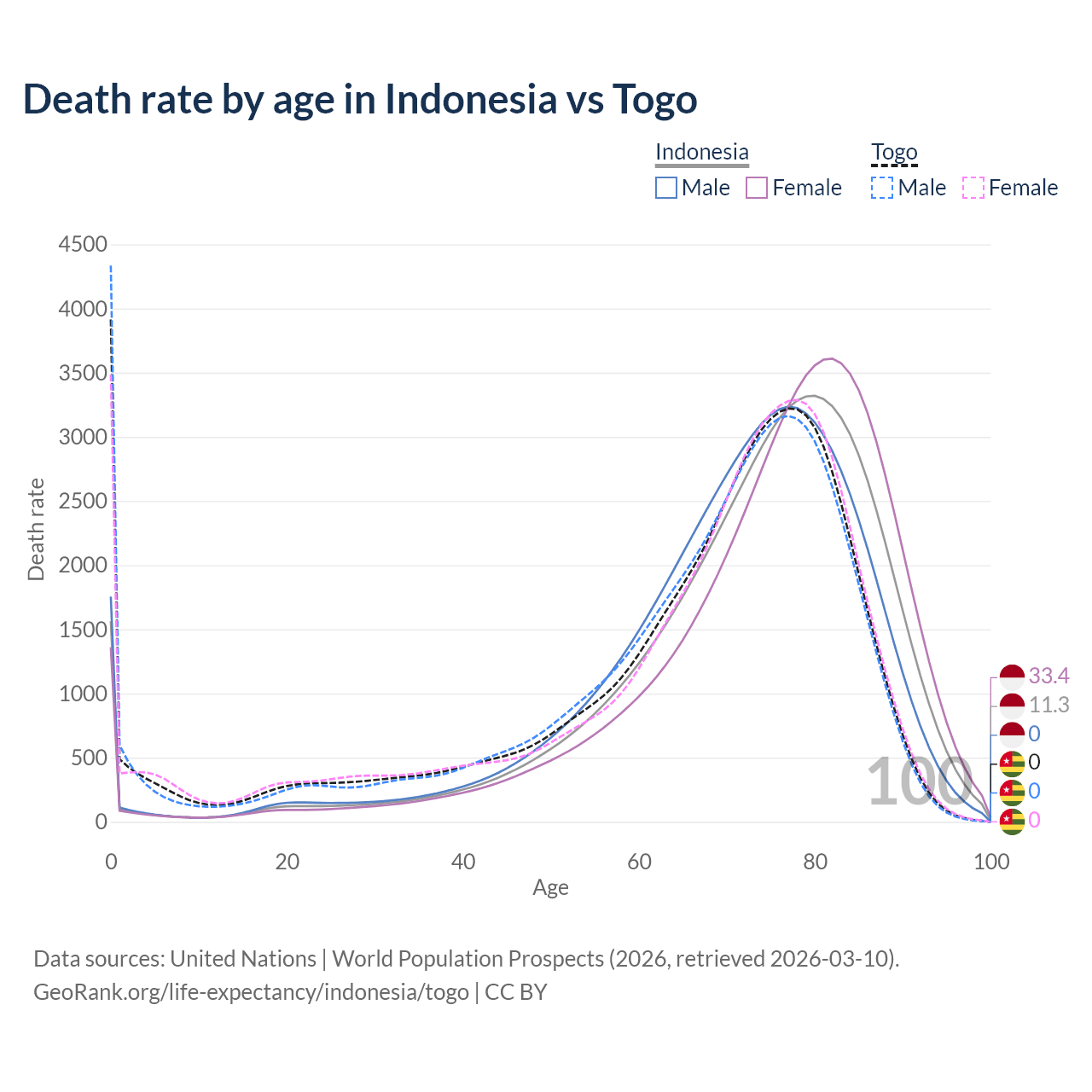 The average life expectancy at birth is 71.6 years in Indonesia vs 63.3 in Togo. Indonesia is ranked 130/197 by life expectancy, and Togo is 181/197. In Indonesia, the life expectancy is 69.4 years for males and 73.8 years for females. In Togo, it's 63 years for males and 63.6 years for females.