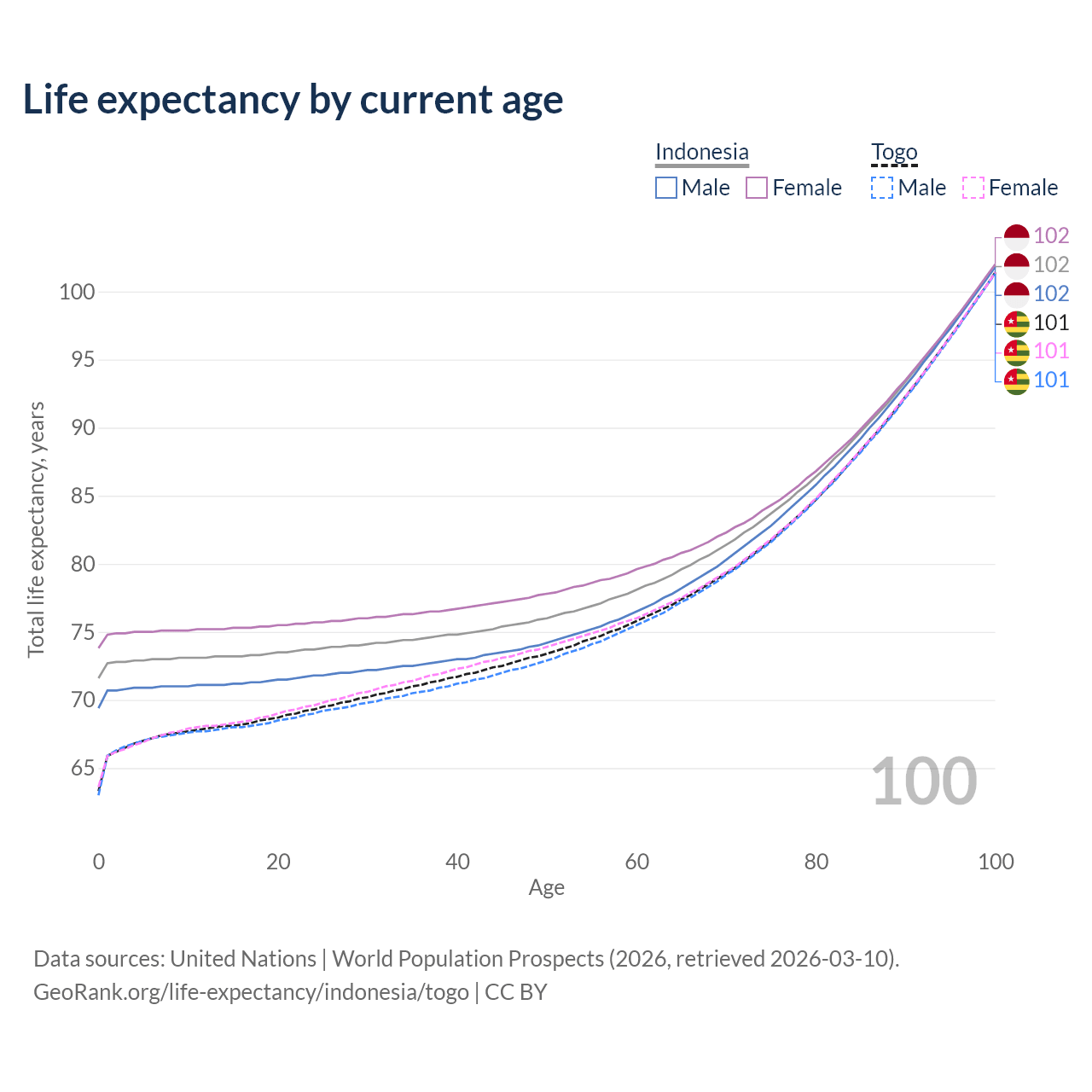 This life expectancy calculator shows the odds of living to 100, 95, 90, and below based on current age for both males and females in Indonesia and Togo, along with mean and median age of death. The calculations are based on the 2026 life tables (actuarial tables) from the UN World Population Prospects.