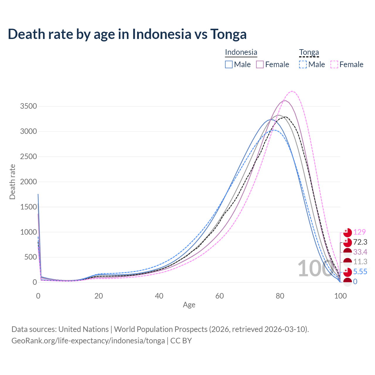 In Indonesia, the most common age of death is 80, compared to 82 in Tonga. The median age of death is 75.6 in Indonesia and 77 in Tonga, meaning only half of each cohort is expected to live past that age.