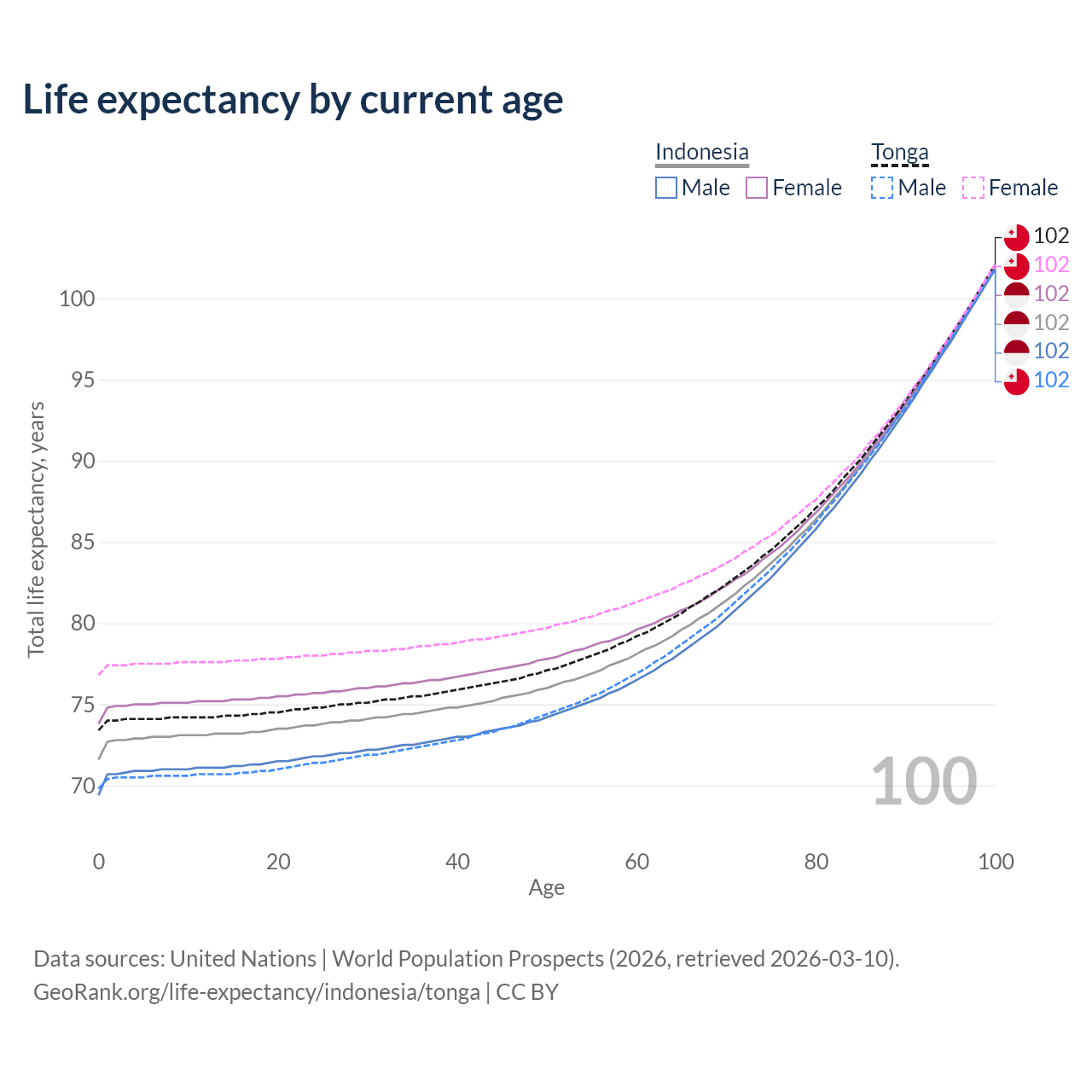 This life expectancy calculator shows the odds of living to 100, 95, 90, and below based on current age for both males and females in Indonesia and Tonga, along with mean and median age of death. The calculations are based on the 2026 life tables (actuarial tables) from the UN World Population Prospects.