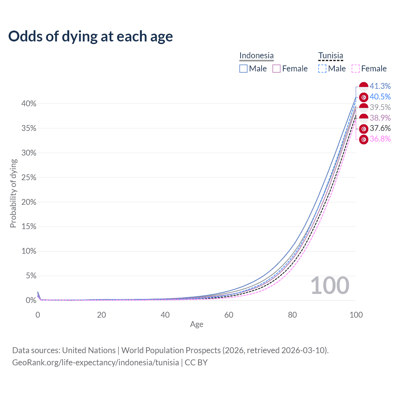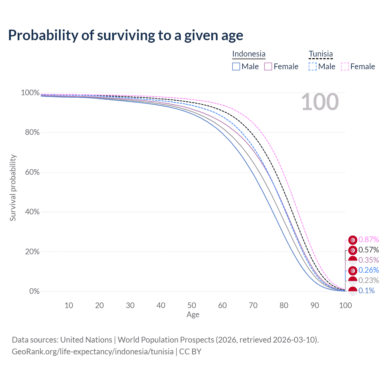 This life expectancy calculator shows the odds of living to 100, 95, 90, and below based on current age for both males and females in Indonesia and Tunisia, along with mean and median age of death. The calculations are based on the 2026 life tables (actuarial tables) from the UN World Population Prospects.