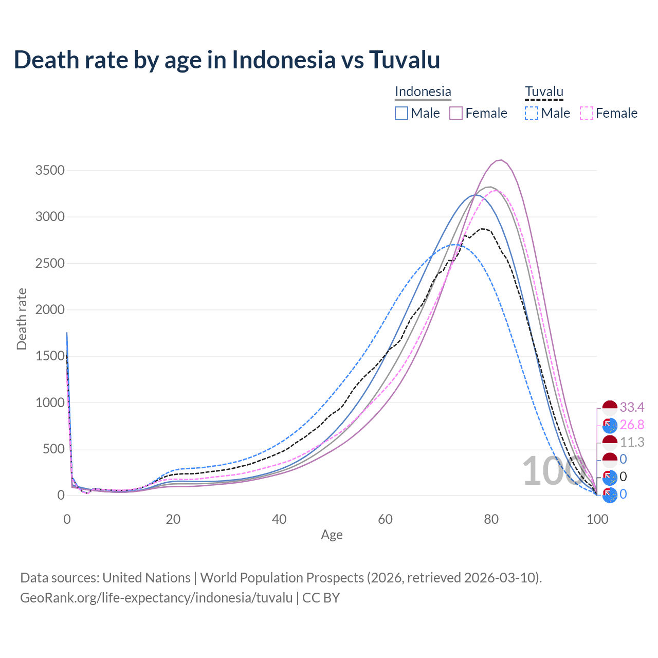 This life expectancy calculator shows the odds of living to 100, 95, 90, and below based on current age for both males and females in Indonesia and Tuvalu, along with mean and median age of death. The calculations are based on the 2026 life tables (actuarial tables) from the UN World Population Prospects.