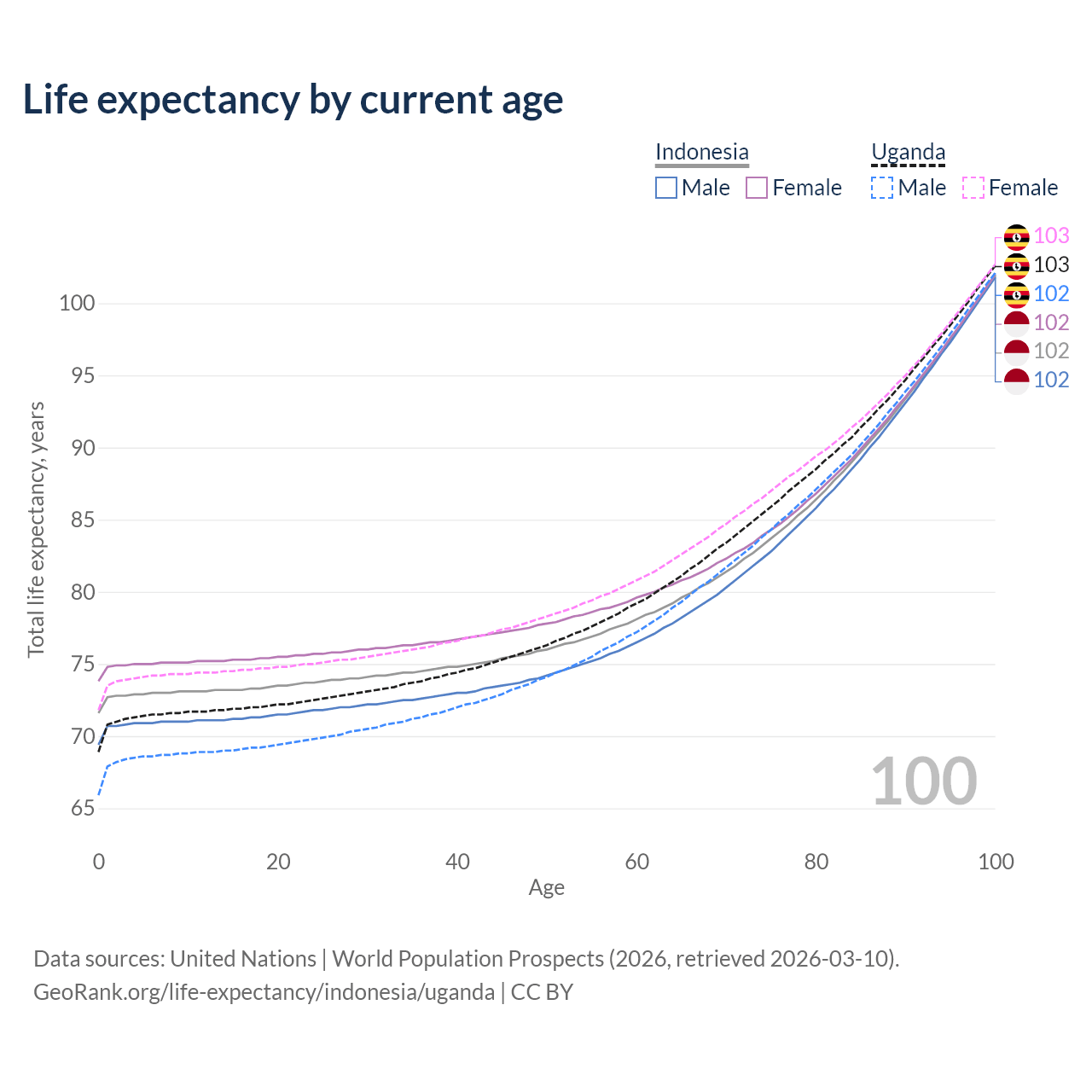 This life expectancy calculator shows the odds of living to 100, 95, 90, and below based on current age for both males and females in Indonesia and Uganda, along with mean and median age of death. The calculations are based on the 2026 life tables (actuarial tables) from the UN World Population Prospects.