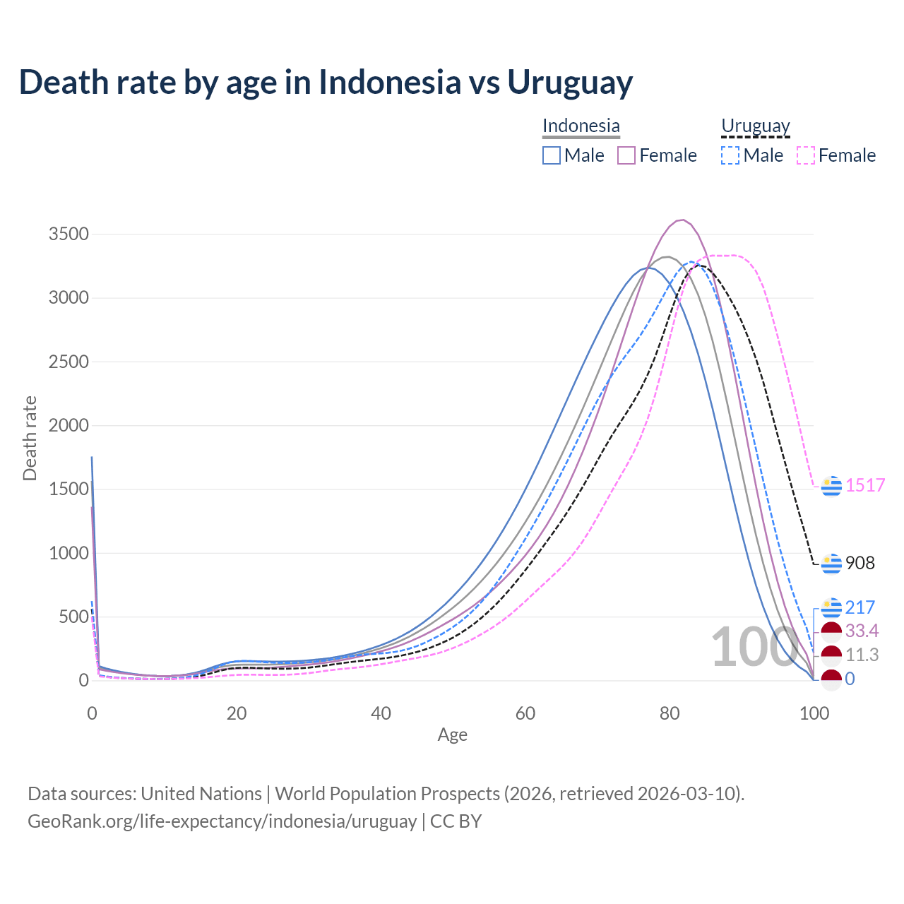 In Indonesia, the most common age of death is 80, compared to 84 in Uruguay. The median age of death is 75.6 in Indonesia and 81.8 in Uruguay, meaning only half of each cohort is expected to live past that age.