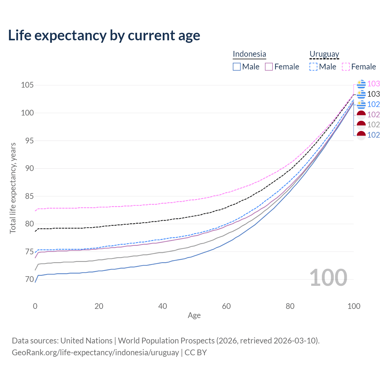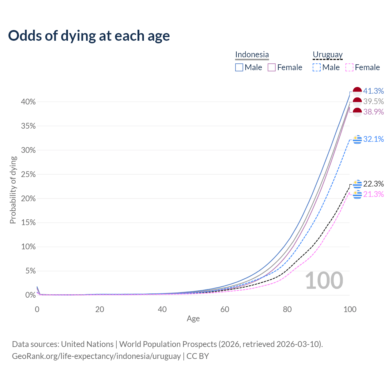 This life expectancy calculator shows the odds of living to 100, 95, 90, and below based on current age for both males and females in Indonesia and Uruguay, along with mean and median age of death. The calculations are based on the 2026 life tables (actuarial tables) from the UN World Population Prospects.