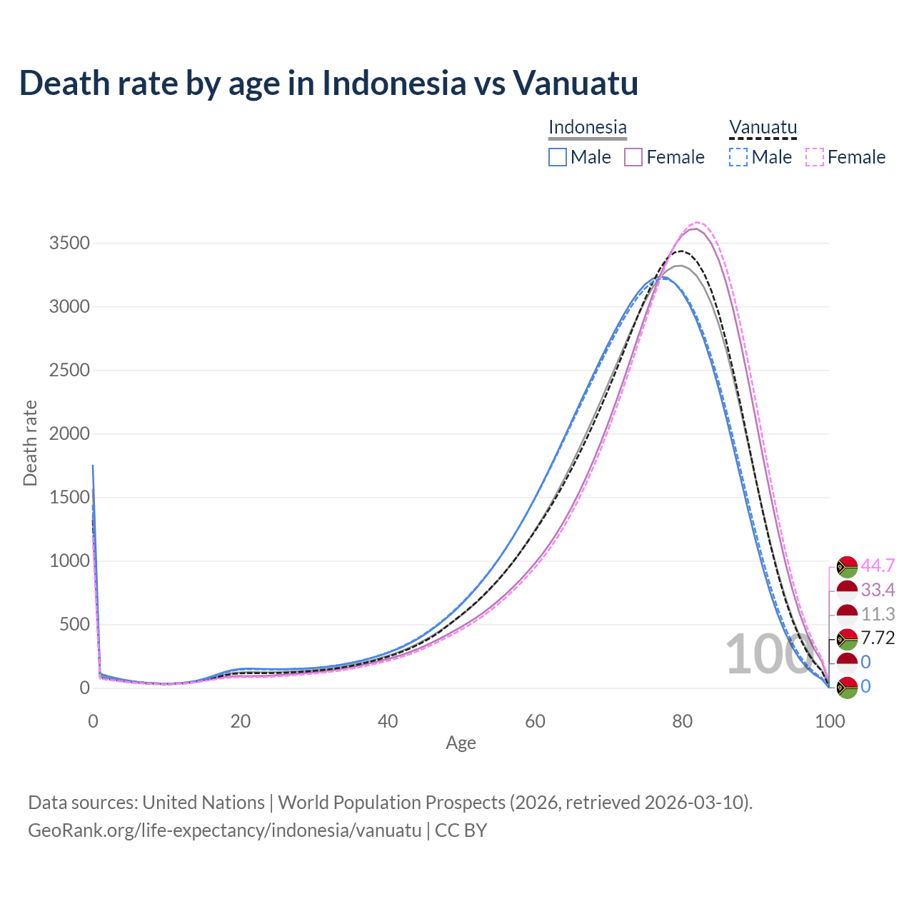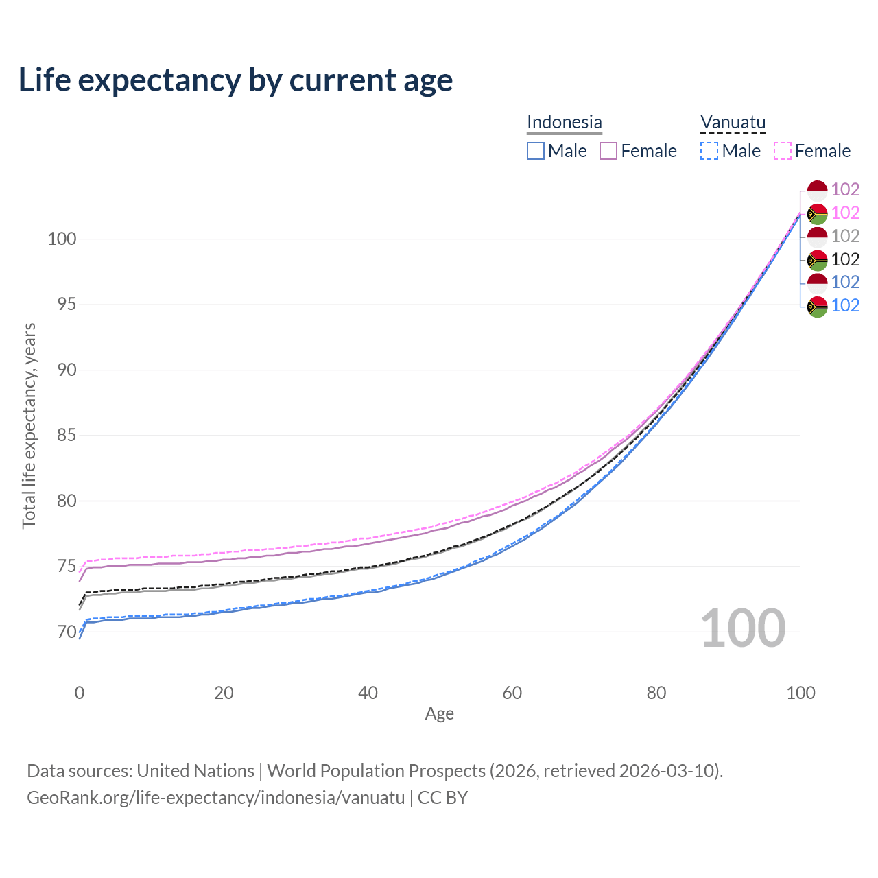 This life expectancy calculator shows the odds of living to 100, 95, 90, and below based on current age for both males and females in Indonesia and Vanuatu, along with mean and median age of death. The calculations are based on the 2026 life tables (actuarial tables) from the UN World Population Prospects.