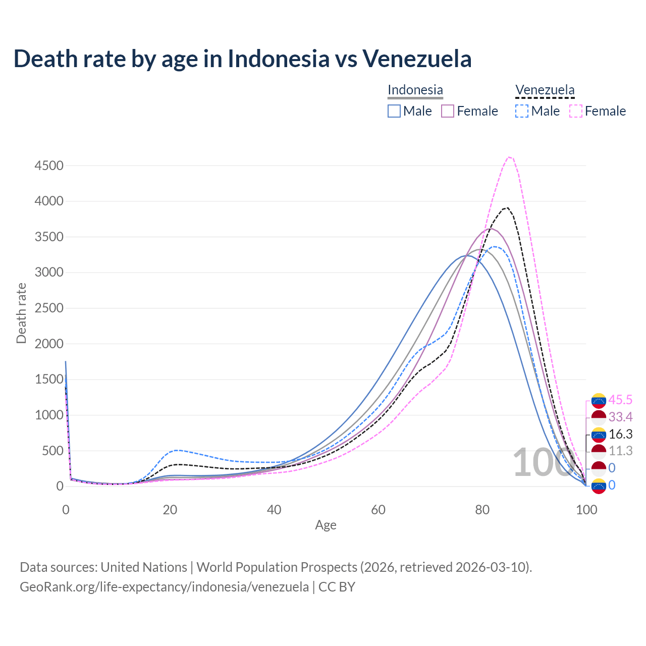 This life expectancy calculator shows the odds of living to 100, 95, 90, and below based on current age for both males and females in Indonesia and Venezuela, along with mean and median age of death. The calculations are based on the 2026 life tables (actuarial tables) from the UN World Population Prospects.
