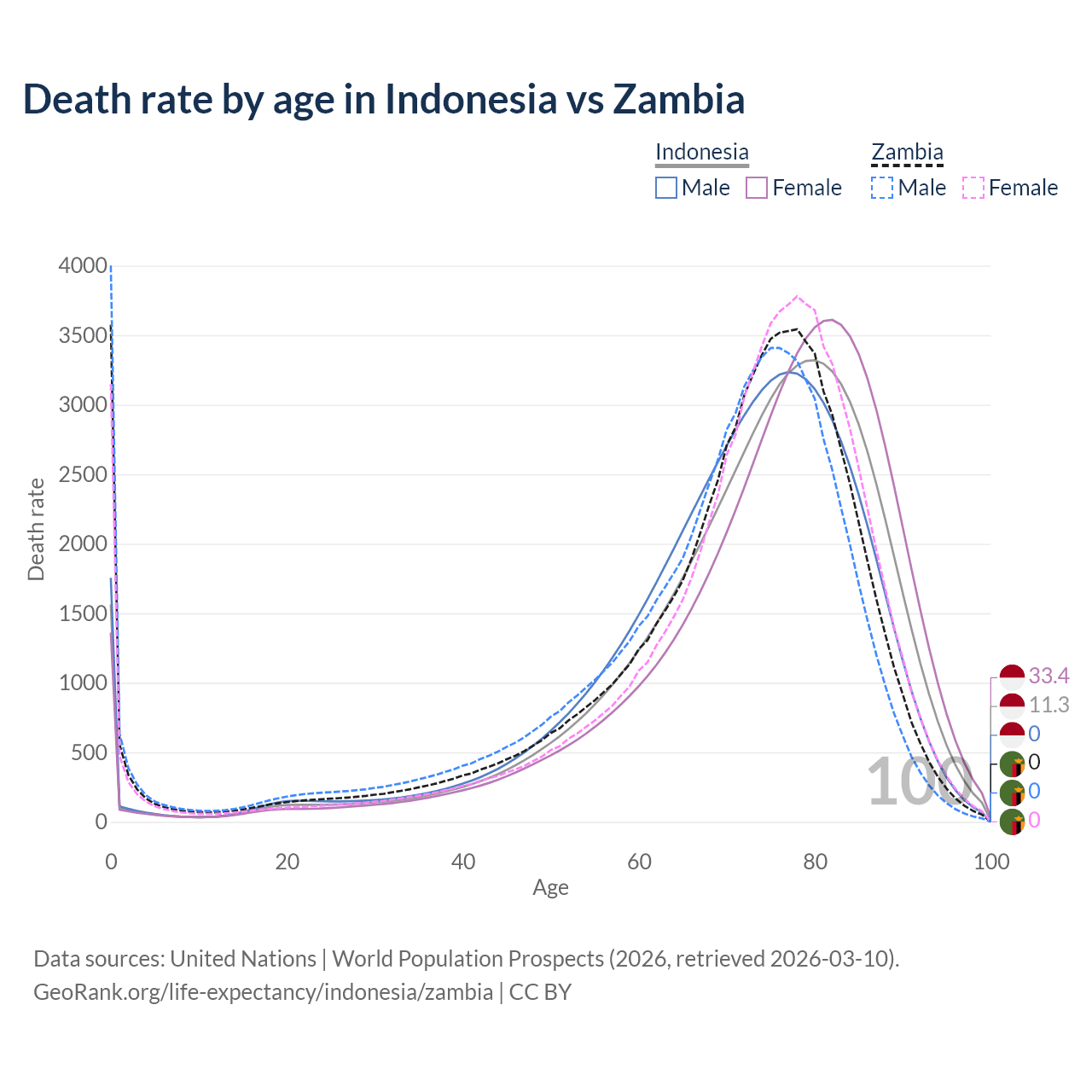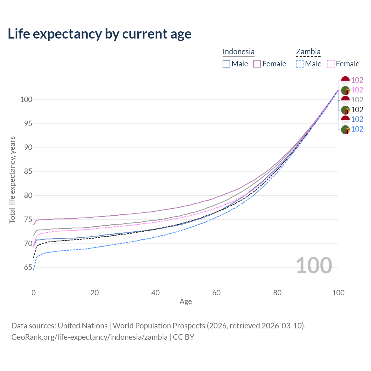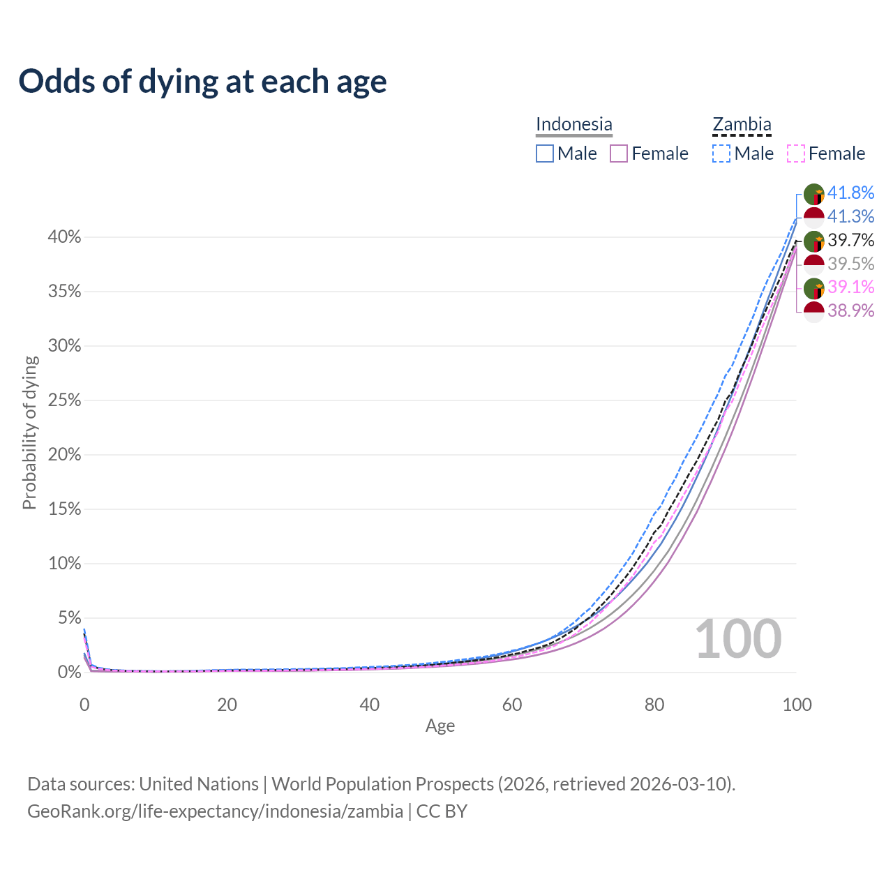 This life expectancy calculator shows the odds of living to 100, 95, 90, and below based on current age for both males and females in Indonesia and Zambia, along with mean and median age of death. The calculations are based on the 2026 life tables (actuarial tables) from the UN World Population Prospects.