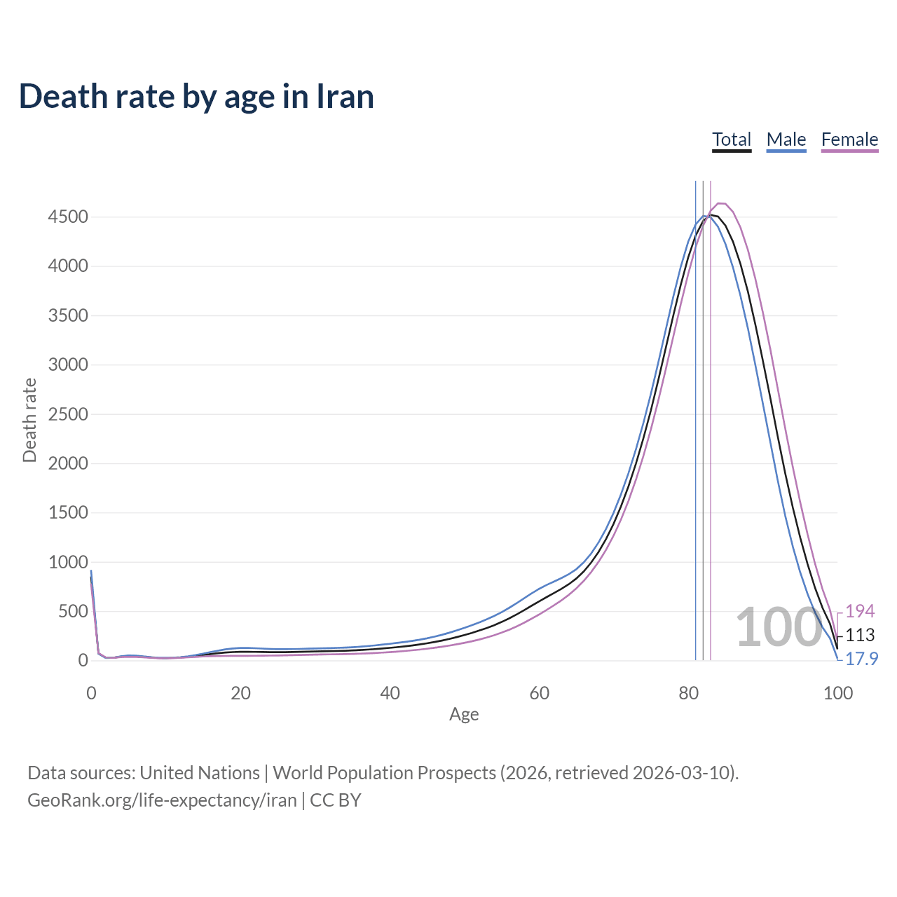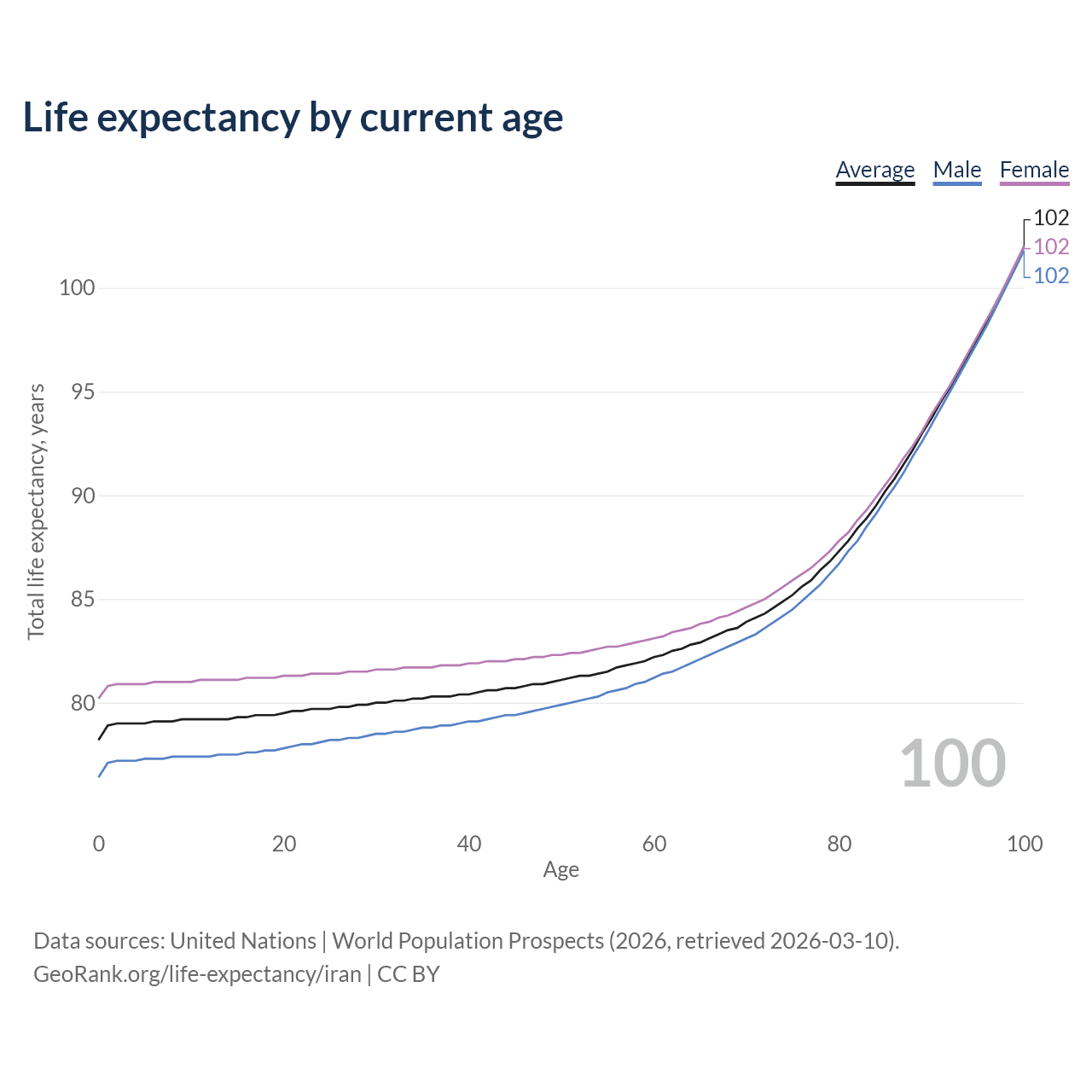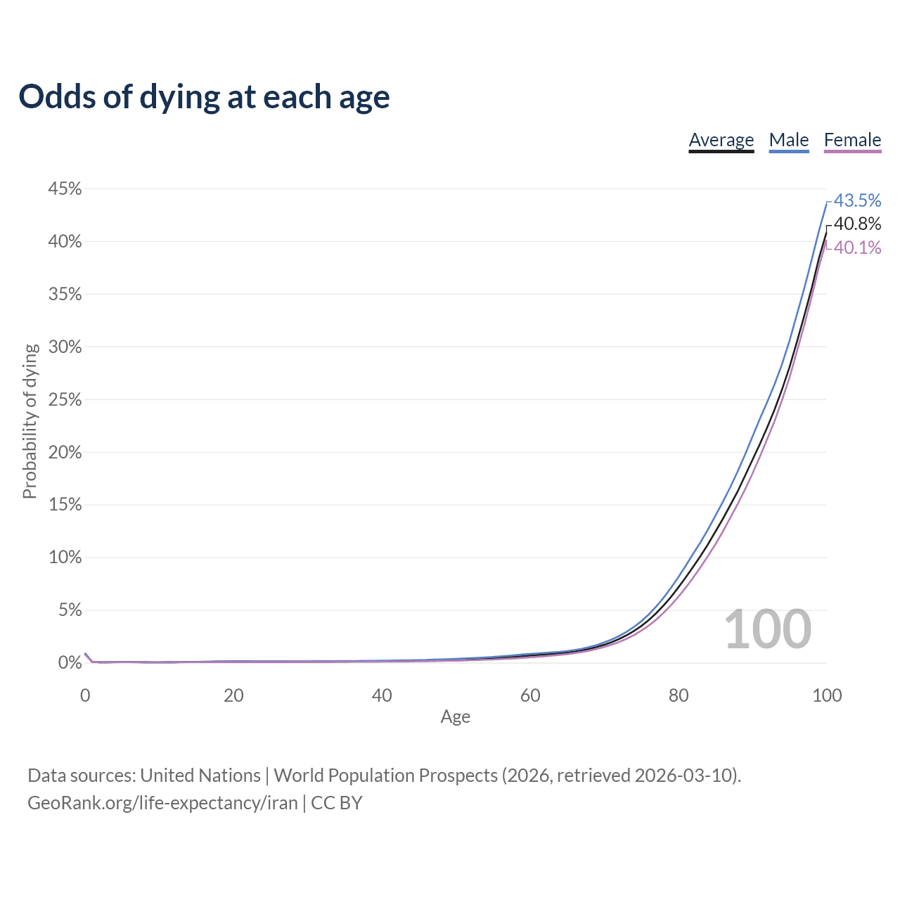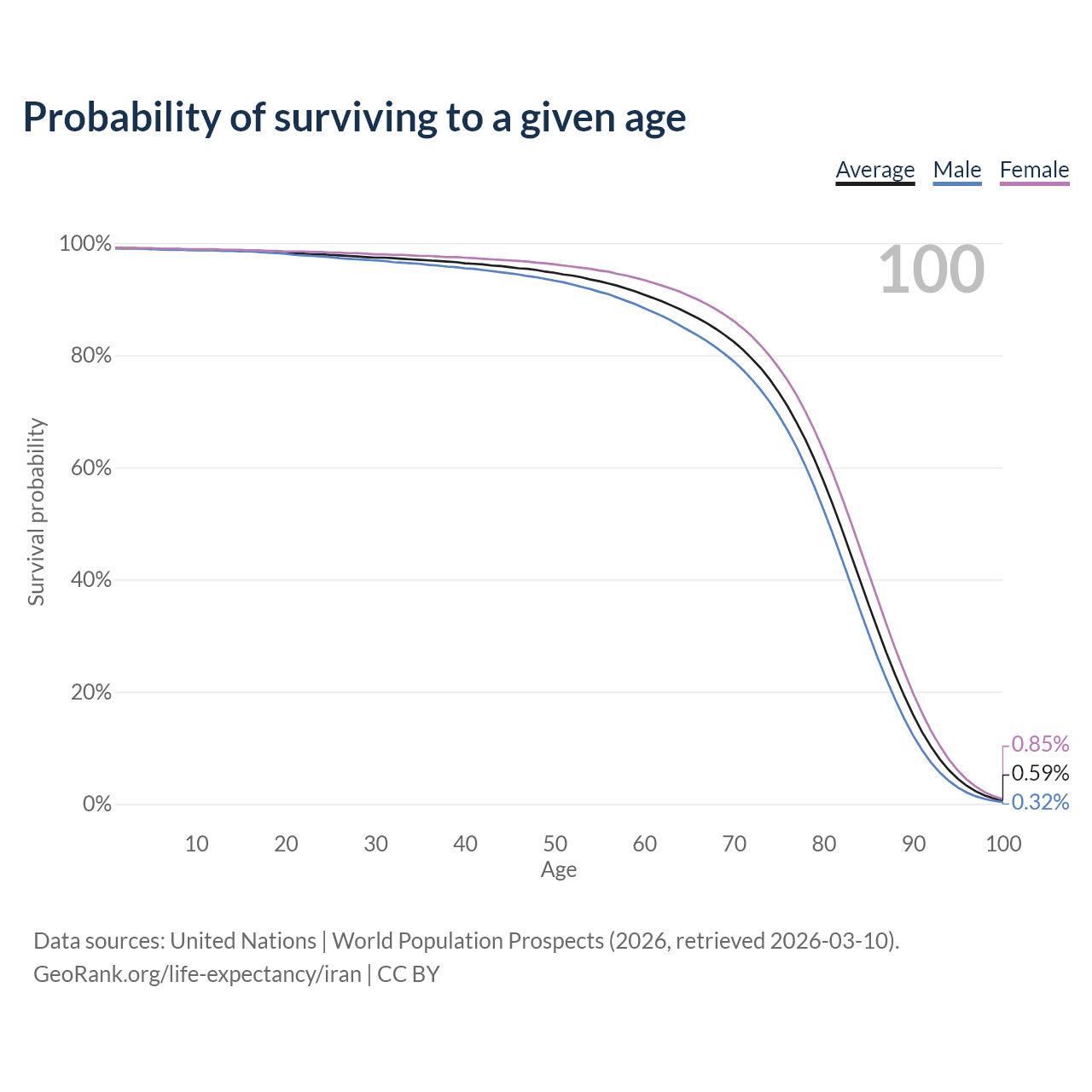 This life expectancy calculator shows the odds of living to 100, 95, 90, and below based on current age for both males and females in Iran, along with mean and median age of death. The calculations are based on the 2026 life tables (actuarial tables) from the UN World Population Prospects.