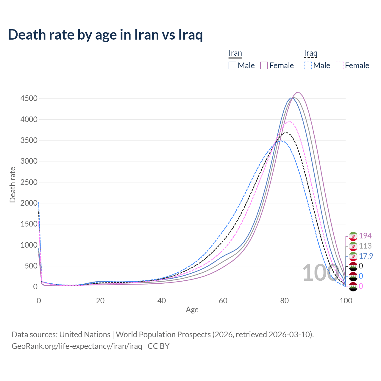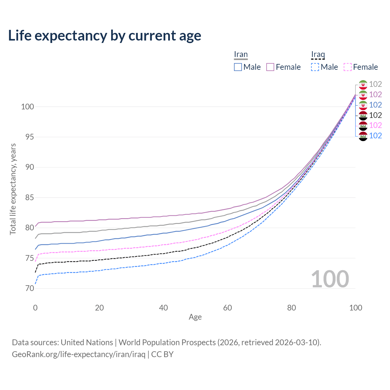 This life expectancy calculator shows the odds of living to 100, 95, 90, and below based on current age for both males and females in Iran and Iraq, along with mean and median age of death. The calculations are based on the 2026 life tables (actuarial tables) from the UN World Population Prospects.