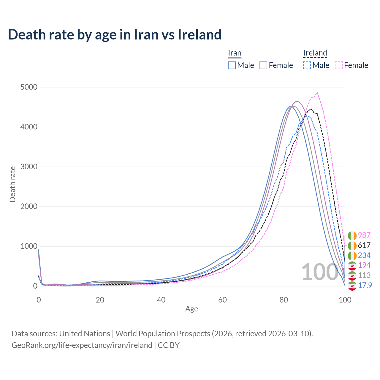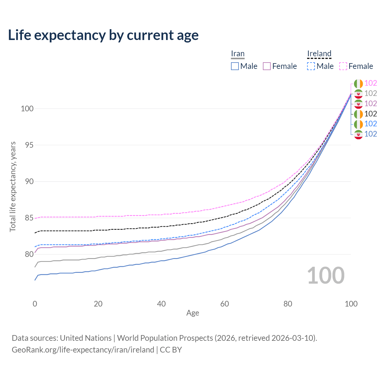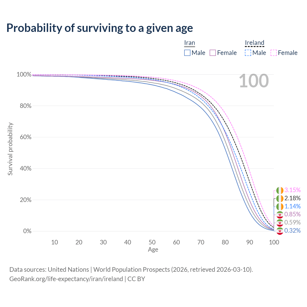 This life expectancy calculator shows the odds of living to 100, 95, 90, and below based on current age for both males and females in Iran and Ireland, along with mean and median age of death. The calculations are based on the 2026 life tables (actuarial tables) from the UN World Population Prospects.