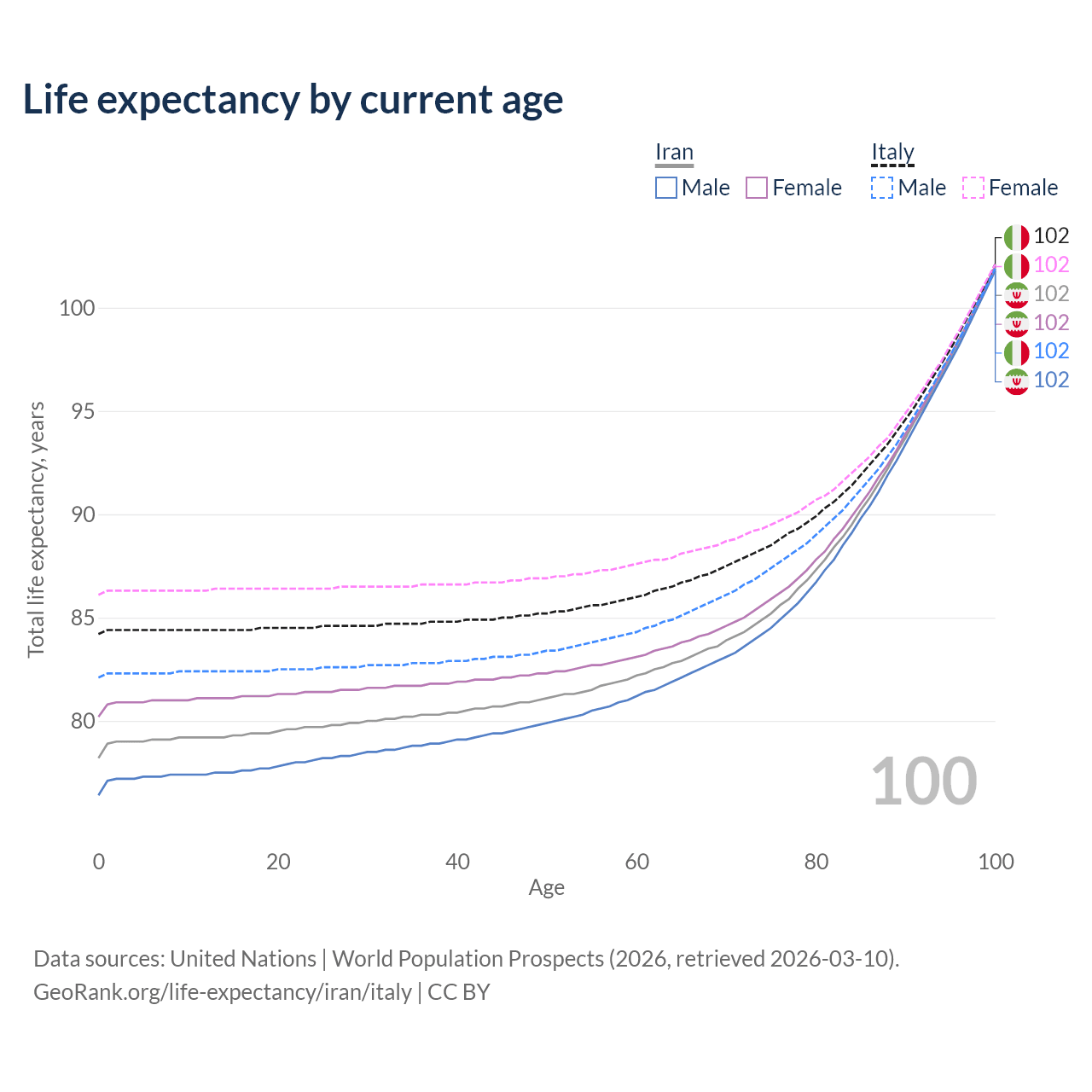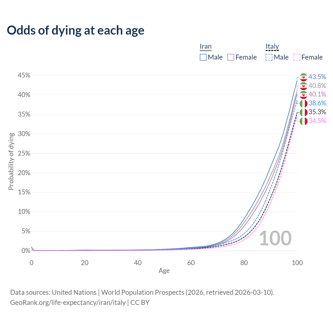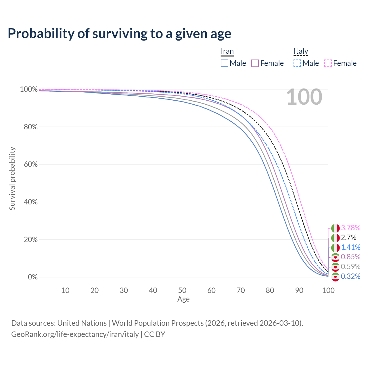 This life expectancy calculator shows the odds of living to 100, 95, 90, and below based on current age for both males and females in Iran and Italy, along with mean and median age of death. The calculations are based on the 2026 life tables (actuarial tables) from the UN World Population Prospects.