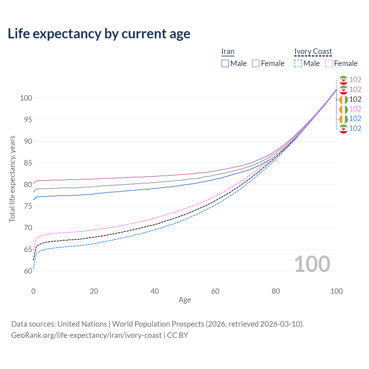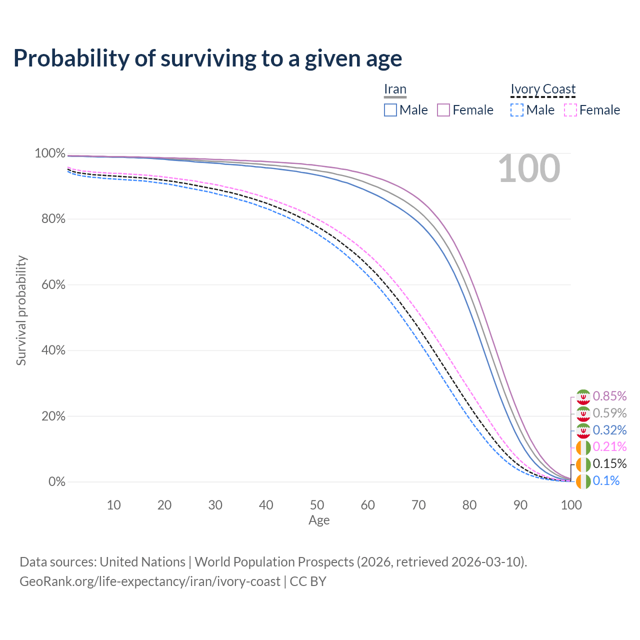 This life expectancy calculator shows the odds of living to 100, 95, 90, and below based on current age for both males and females in Iran and Ivory Coast, along with mean and median age of death. The calculations are based on the 2026 life tables (actuarial tables) from the UN World Population Prospects.