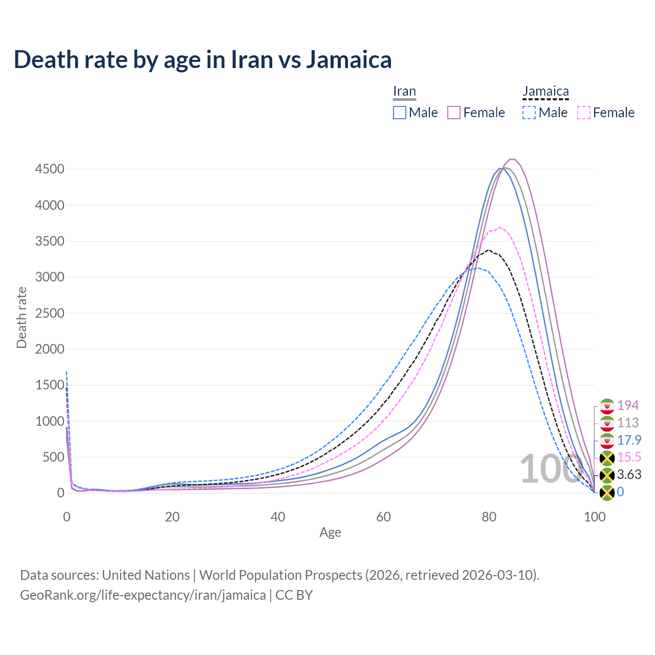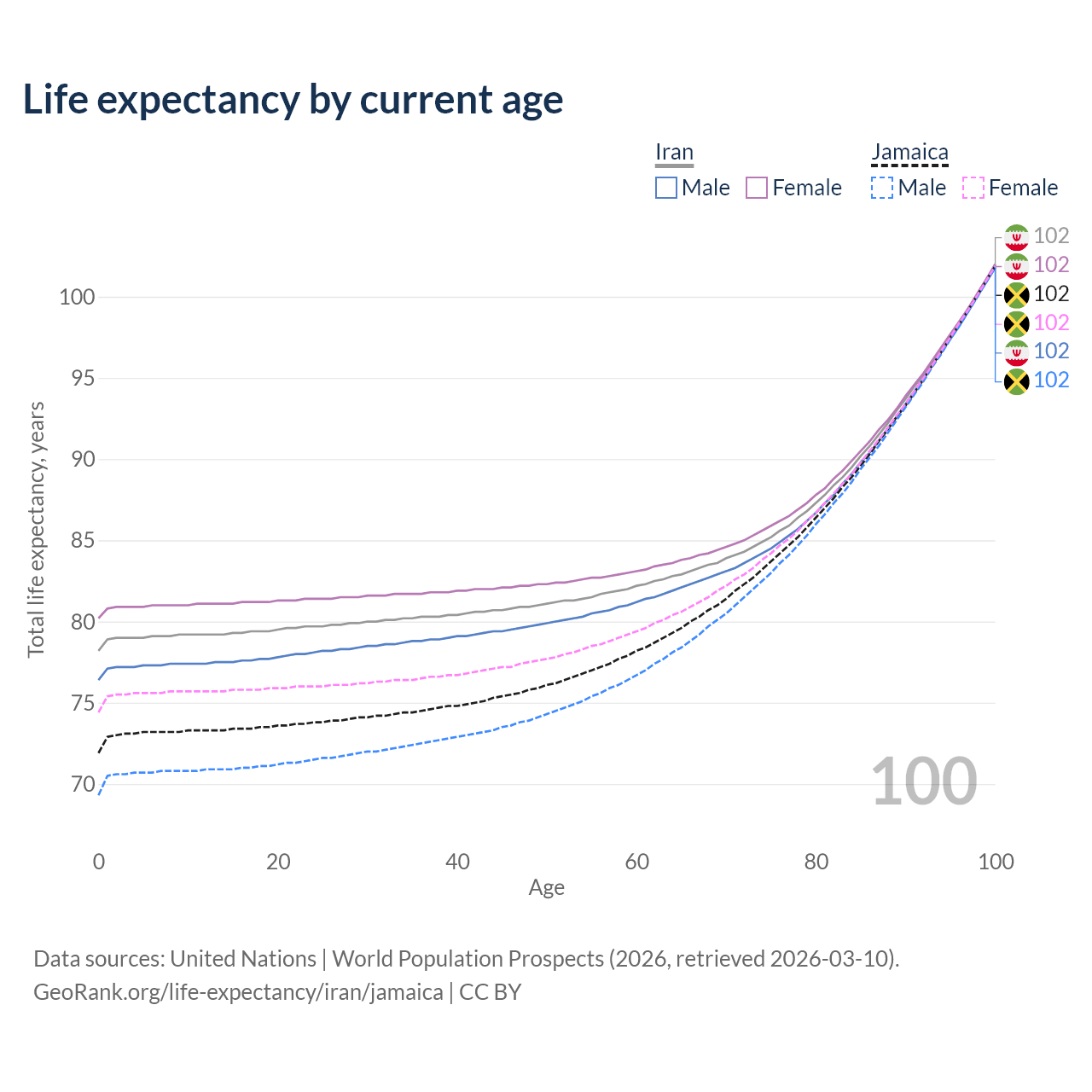 This life expectancy calculator shows the odds of living to 100, 95, 90, and below based on current age for both males and females in Iran and Jamaica, along with mean and median age of death. The calculations are based on the 2026 life tables (actuarial tables) from the UN World Population Prospects.