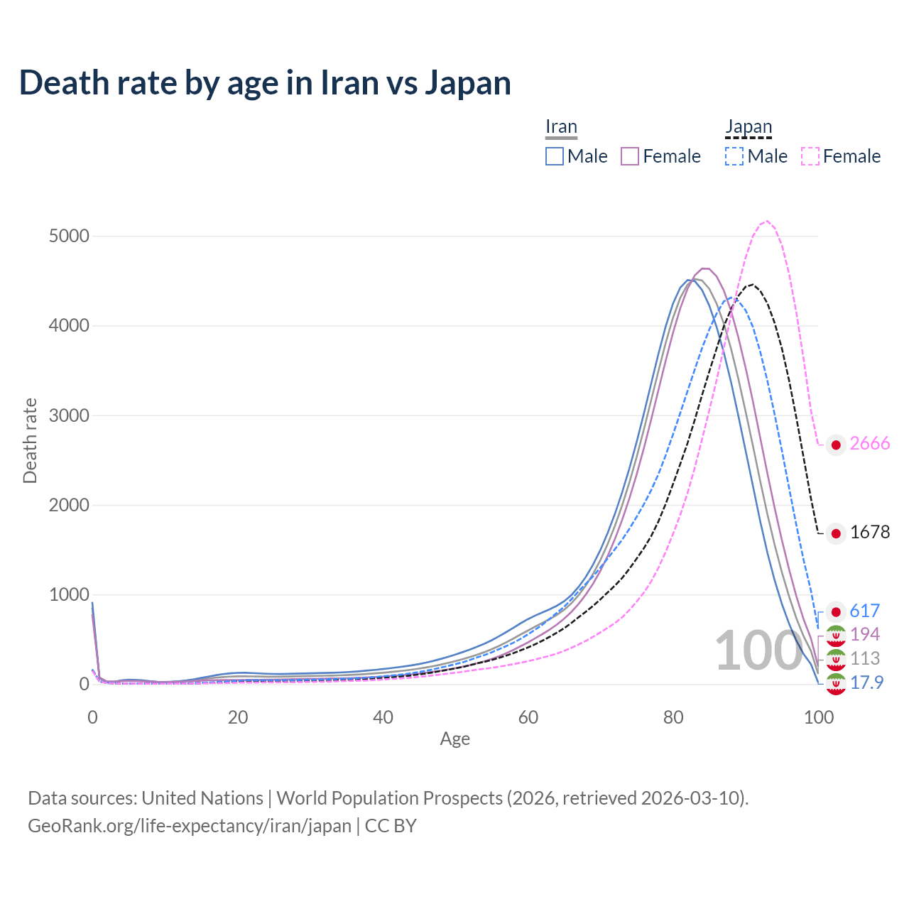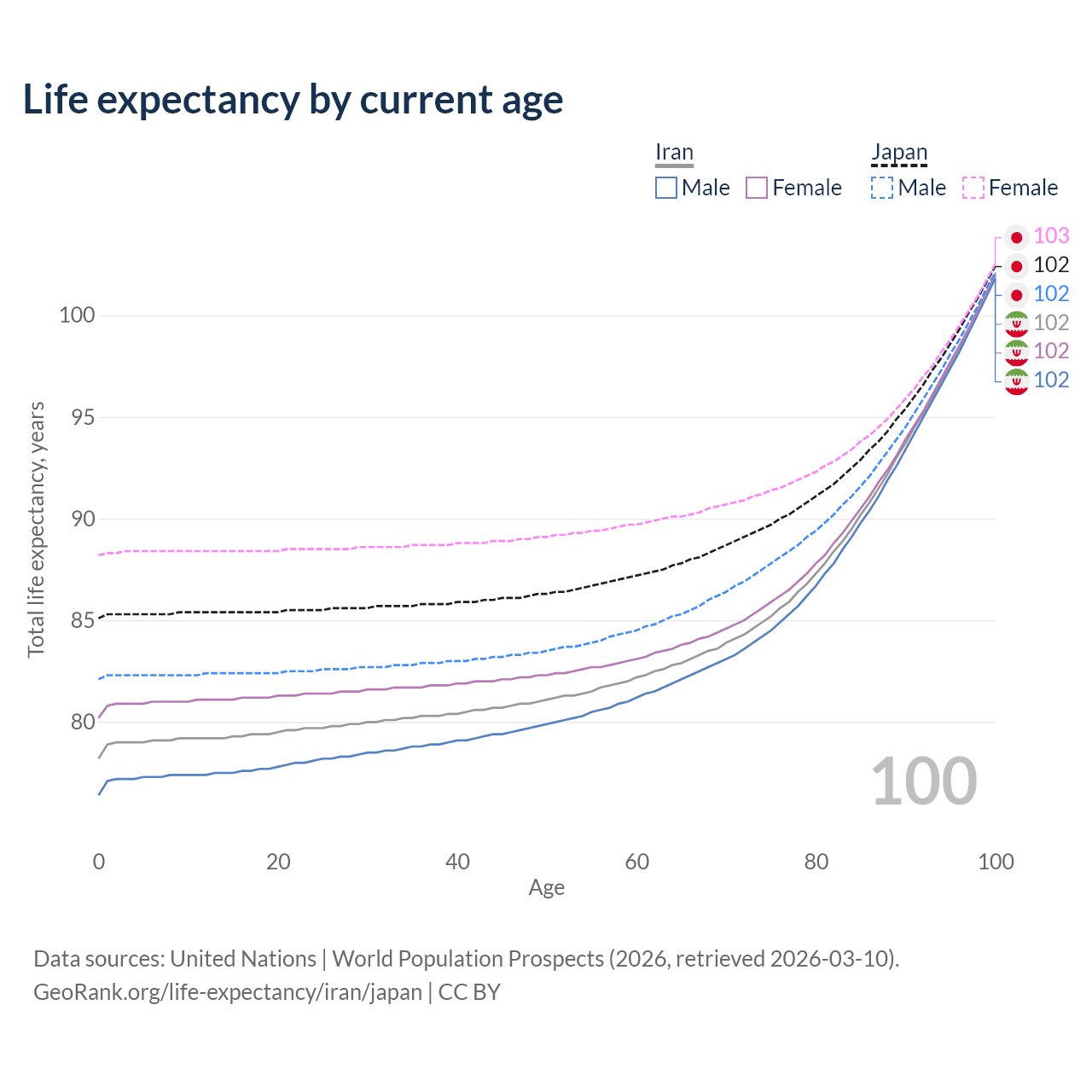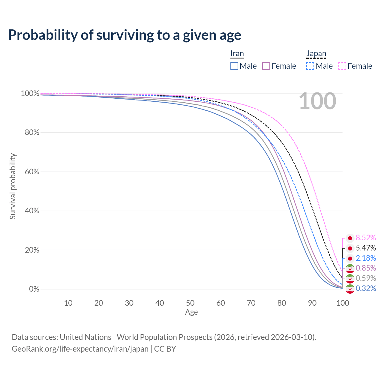 This life expectancy calculator shows the odds of living to 100, 95, 90, and below based on current age for both males and females in Iran and Japan, along with mean and median age of death. The calculations are based on the 2026 life tables (actuarial tables) from the UN World Population Prospects.
