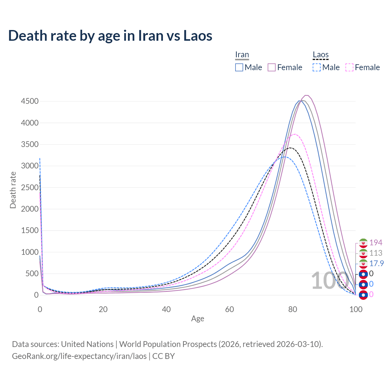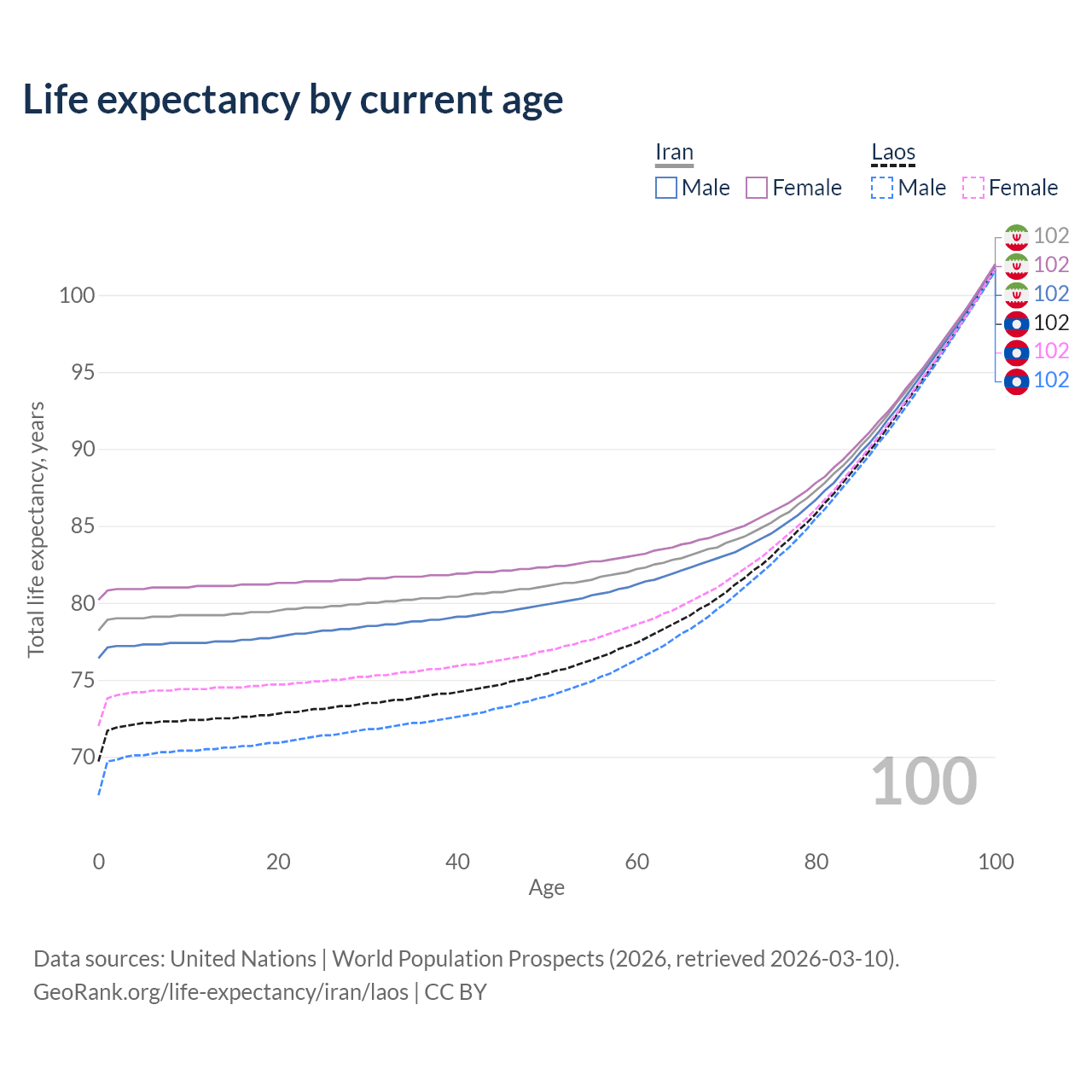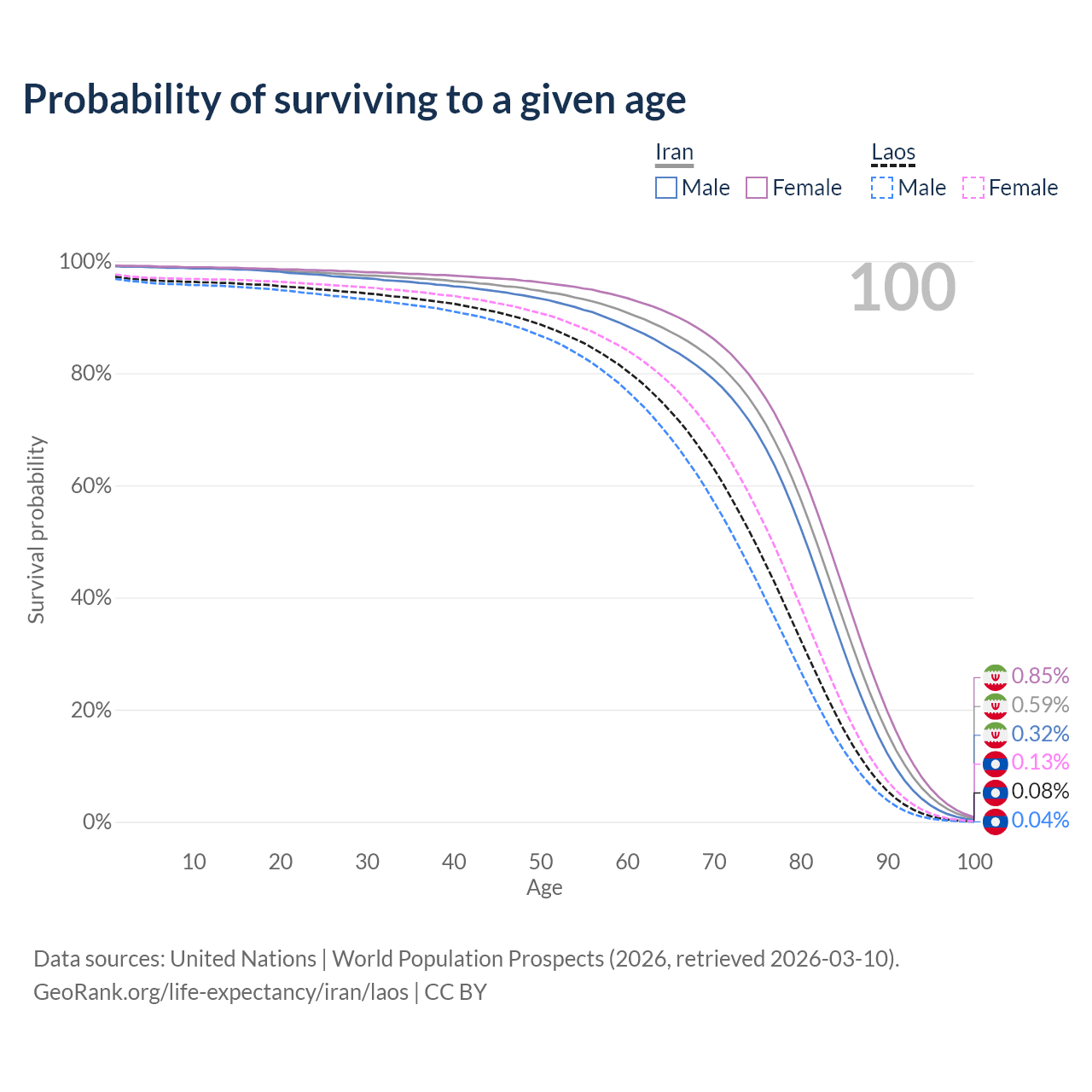 This life expectancy calculator shows the odds of living to 100, 95, 90, and below based on current age for both males and females in Iran and Laos, along with mean and median age of death. The calculations are based on the 2026 life tables (actuarial tables) from the UN World Population Prospects.