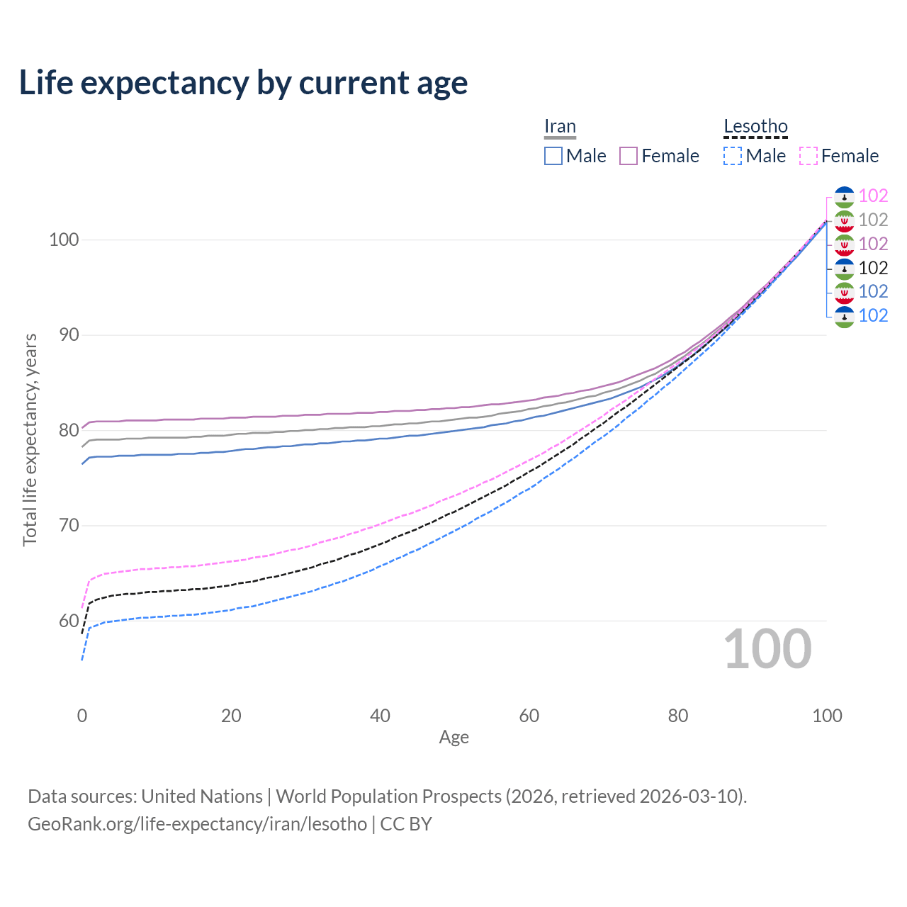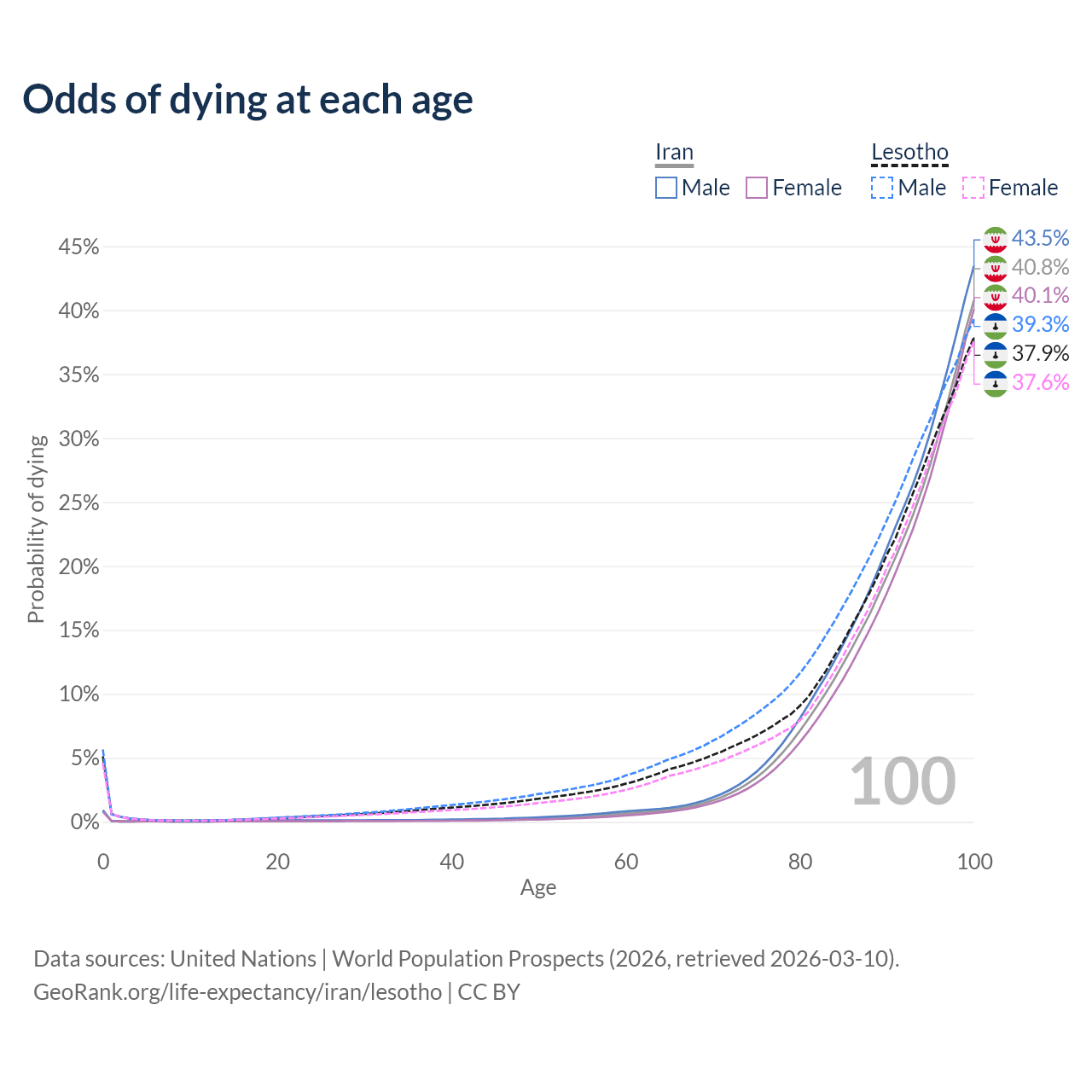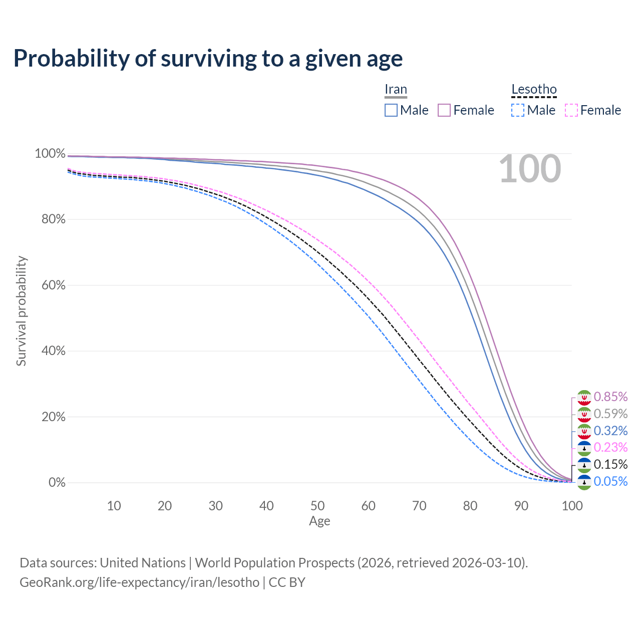This life expectancy calculator shows the odds of living to 100, 95, 90, and below based on current age for both males and females in Iran and Lesotho, along with mean and median age of death. The calculations are based on the 2026 life tables (actuarial tables) from the UN World Population Prospects.