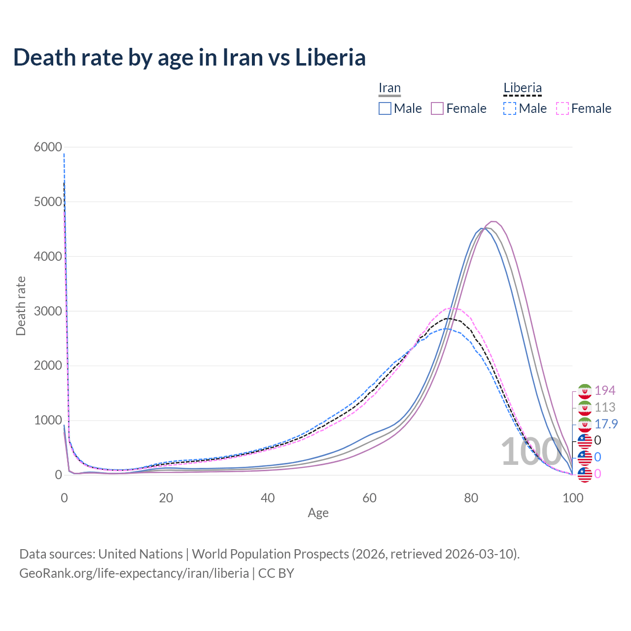 The average life expectancy at birth is 78.2 years in Iran vs 62.6 in Liberia. Iran is ranked 61/197 by life expectancy, and Liberia is 182/197. In Iran, the life expectancy is 76.4 years for males and 80.2 years for females. In Liberia, it's 61.3 years for males and 64 years for females.