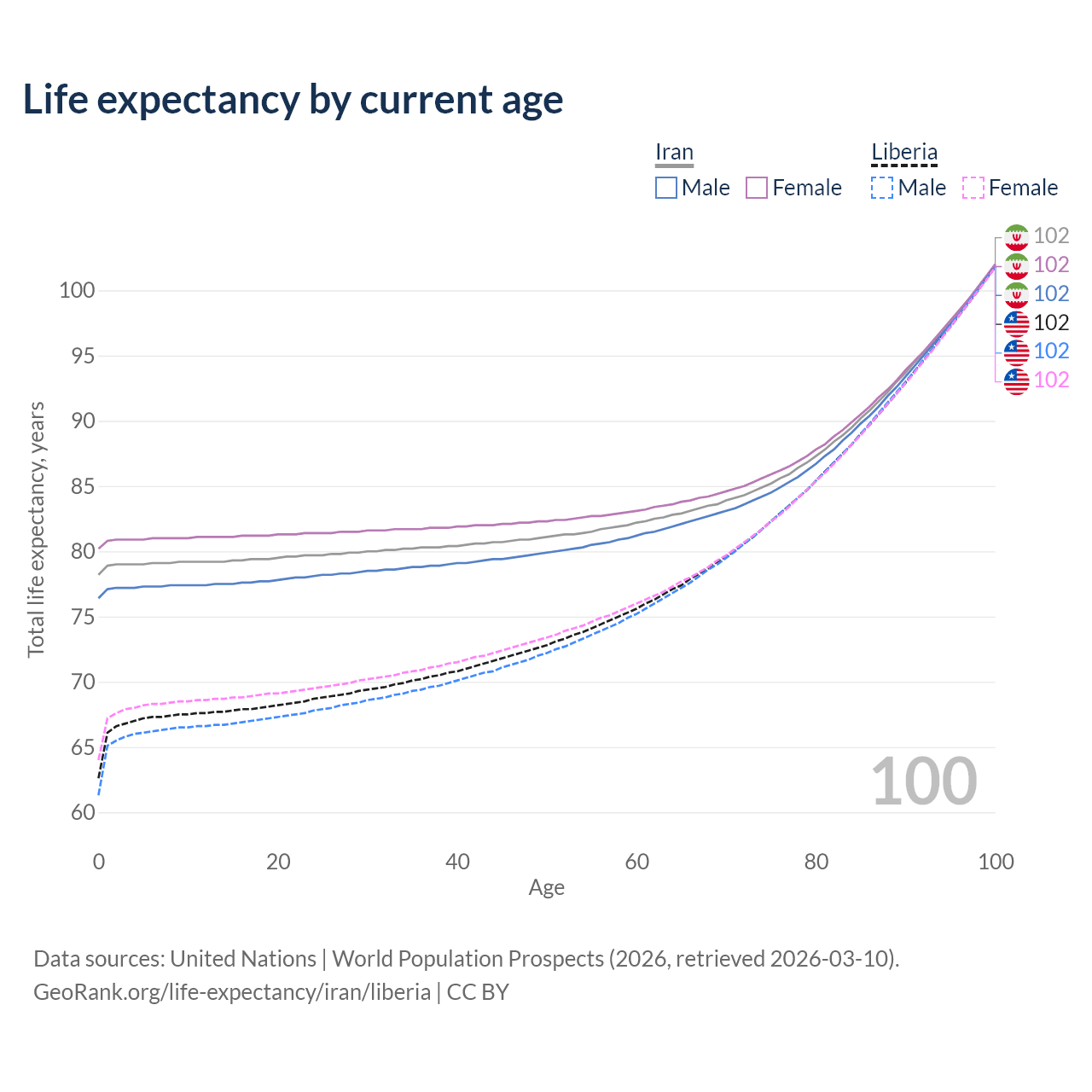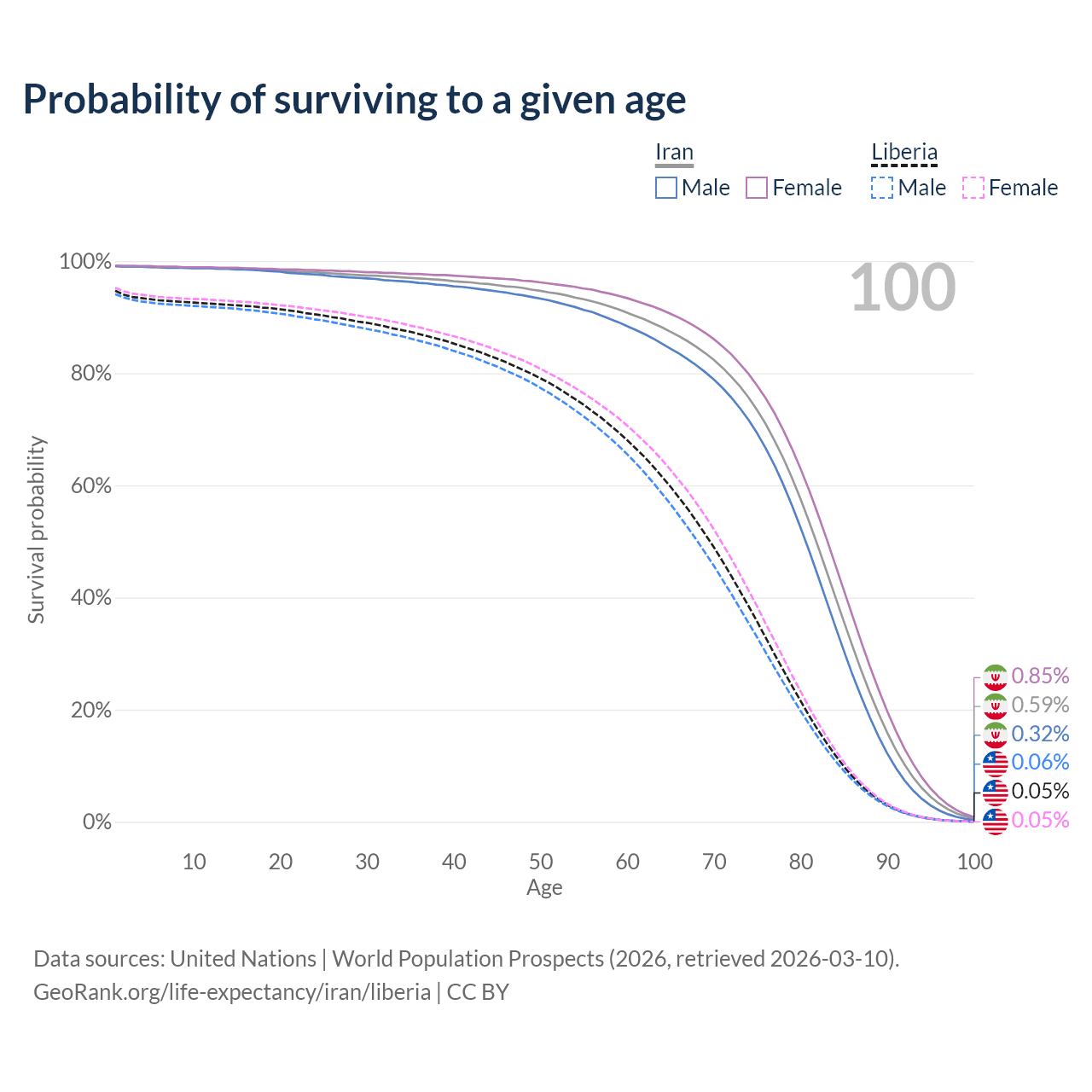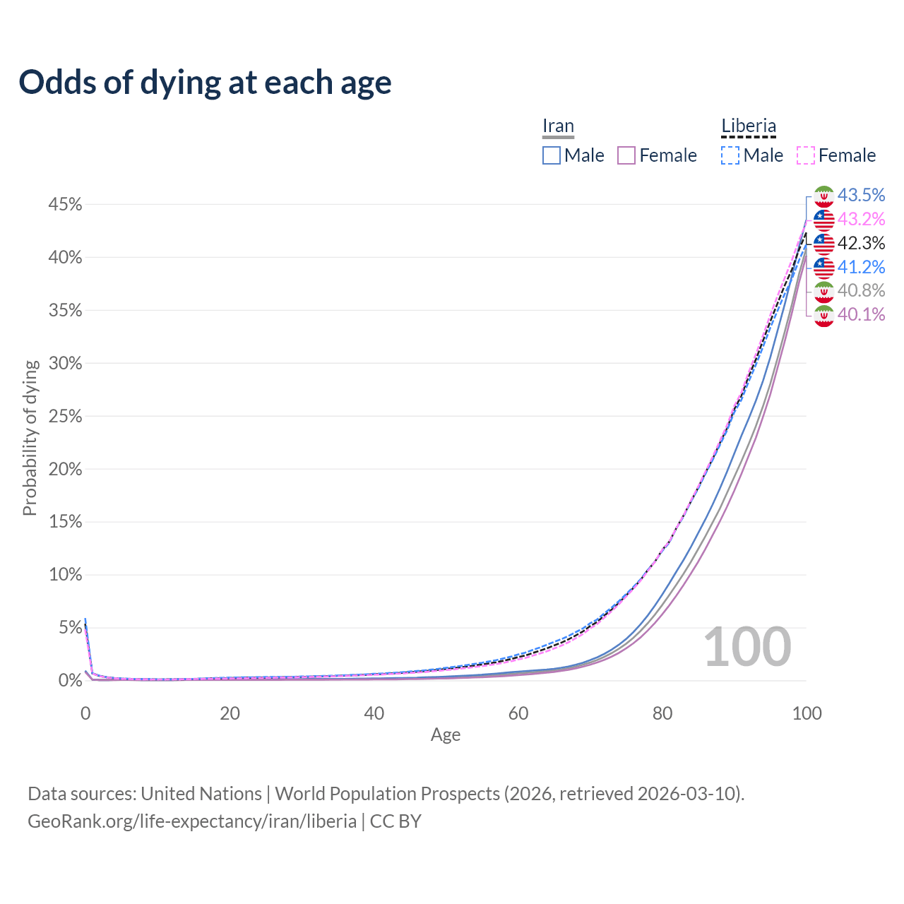 This life expectancy calculator shows the odds of living to 100, 95, 90, and below based on current age for both males and females in Iran and Liberia, along with mean and median age of death. The calculations are based on the 2026 life tables (actuarial tables) from the UN World Population Prospects.