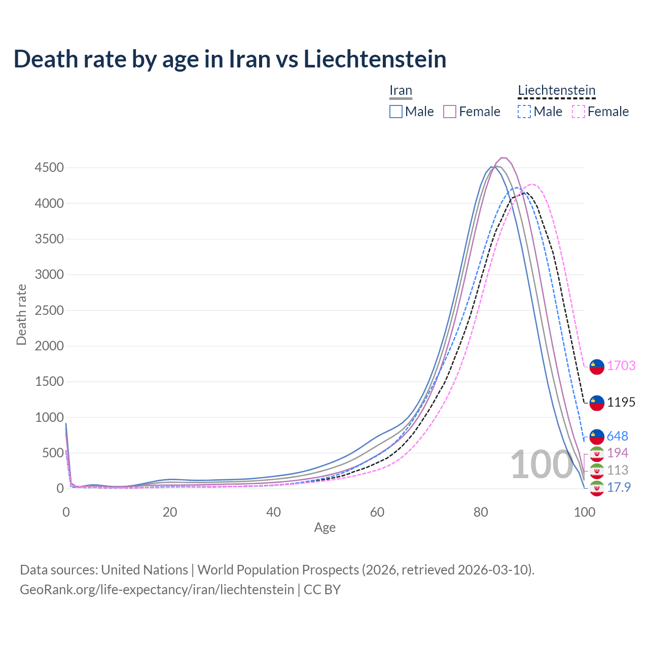 In Iran, the most common age of death is 83, compared to 89 in Liechtenstein. The median age of death is 81.8 in Iran and 86.3 in Liechtenstein, meaning only half of each cohort is expected to live past that age.