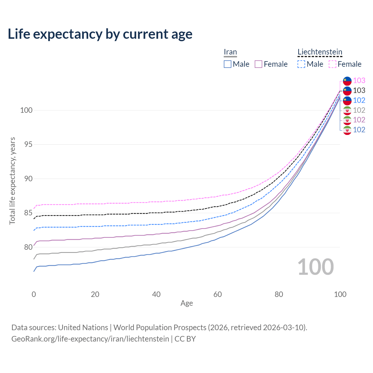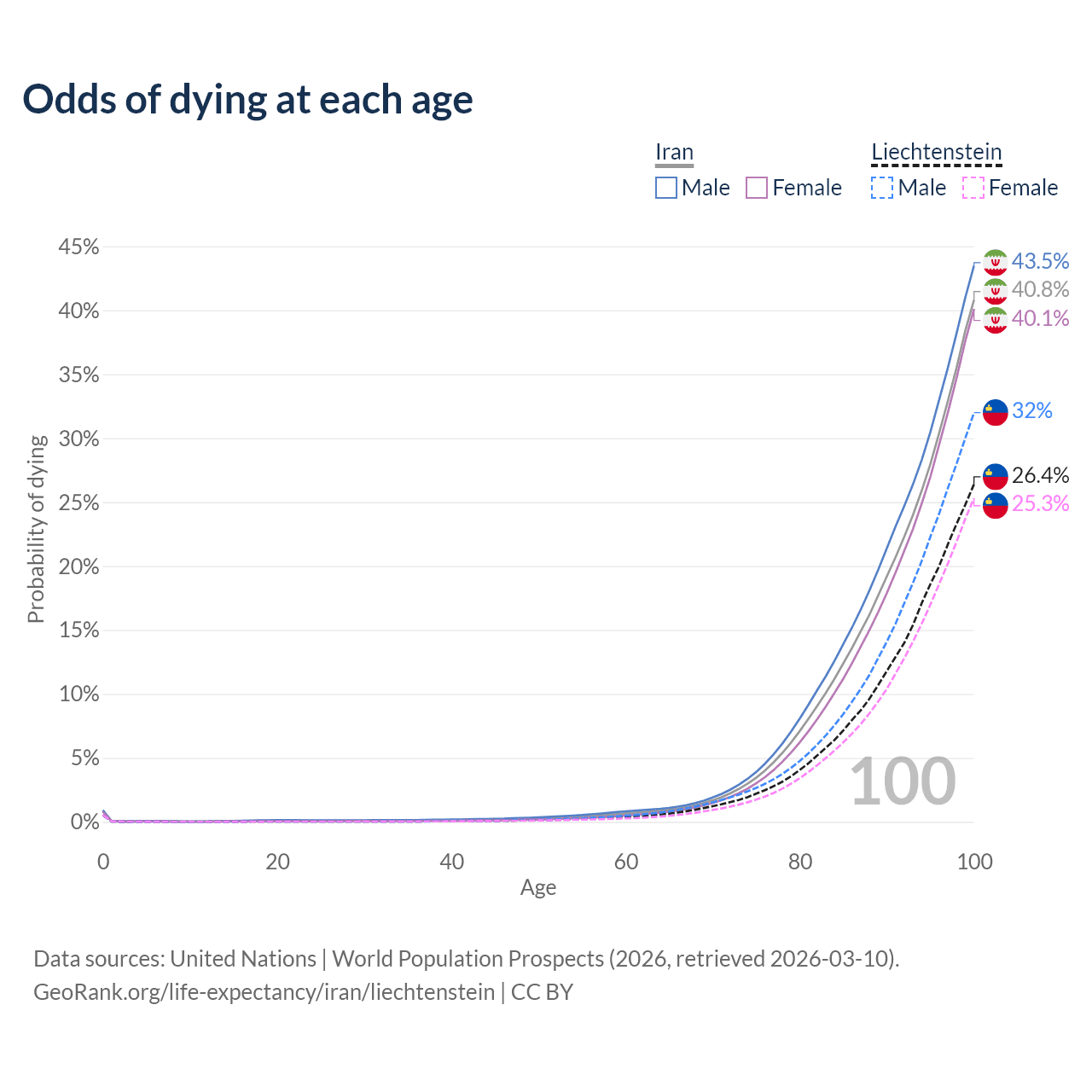 This life expectancy calculator shows the odds of living to 100, 95, 90, and below based on current age for both males and females in Iran and Liechtenstein, along with mean and median age of death. The calculations are based on the 2026 life tables (actuarial tables) from the UN World Population Prospects.
