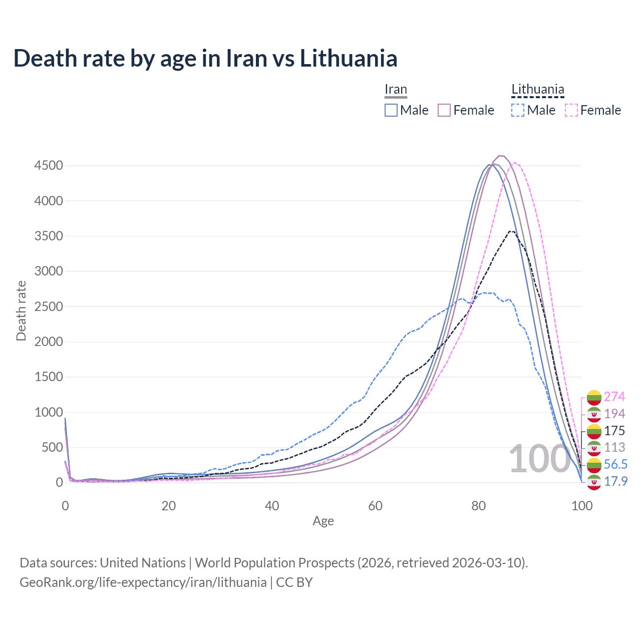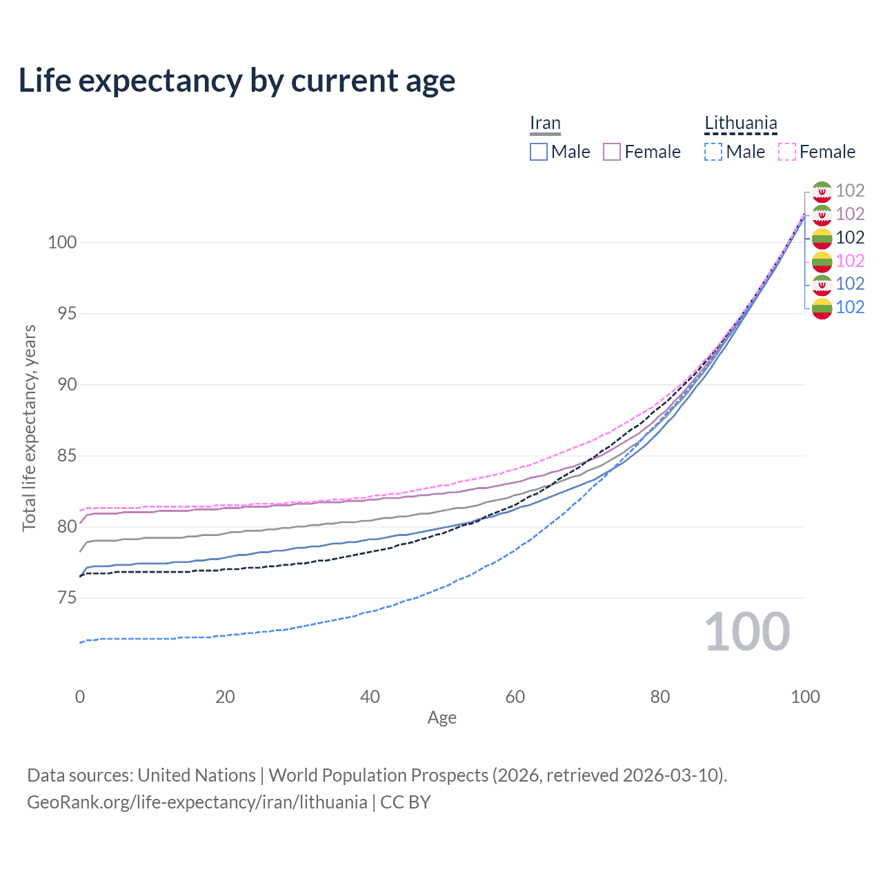This life expectancy calculator shows the odds of living to 100, 95, 90, and below based on current age for both males and females in Iran and Lithuania, along with mean and median age of death. The calculations are based on the 2026 life tables (actuarial tables) from the UN World Population Prospects.