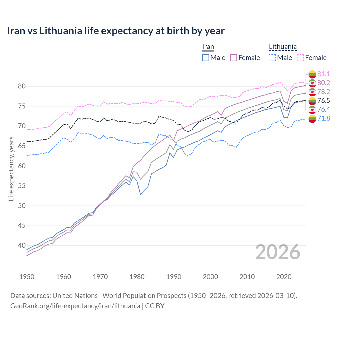 The average life expectancy at birth is 78.2 years in Iran vs 76.5 in Lithuania. Iran is ranked 61/197 by life expectancy, and Lithuania is 80/197. In Iran, the life expectancy is 76.4 years for males and 80.2 years for females. In Lithuania, it's 71.8 years for males and 81.1 years for females.