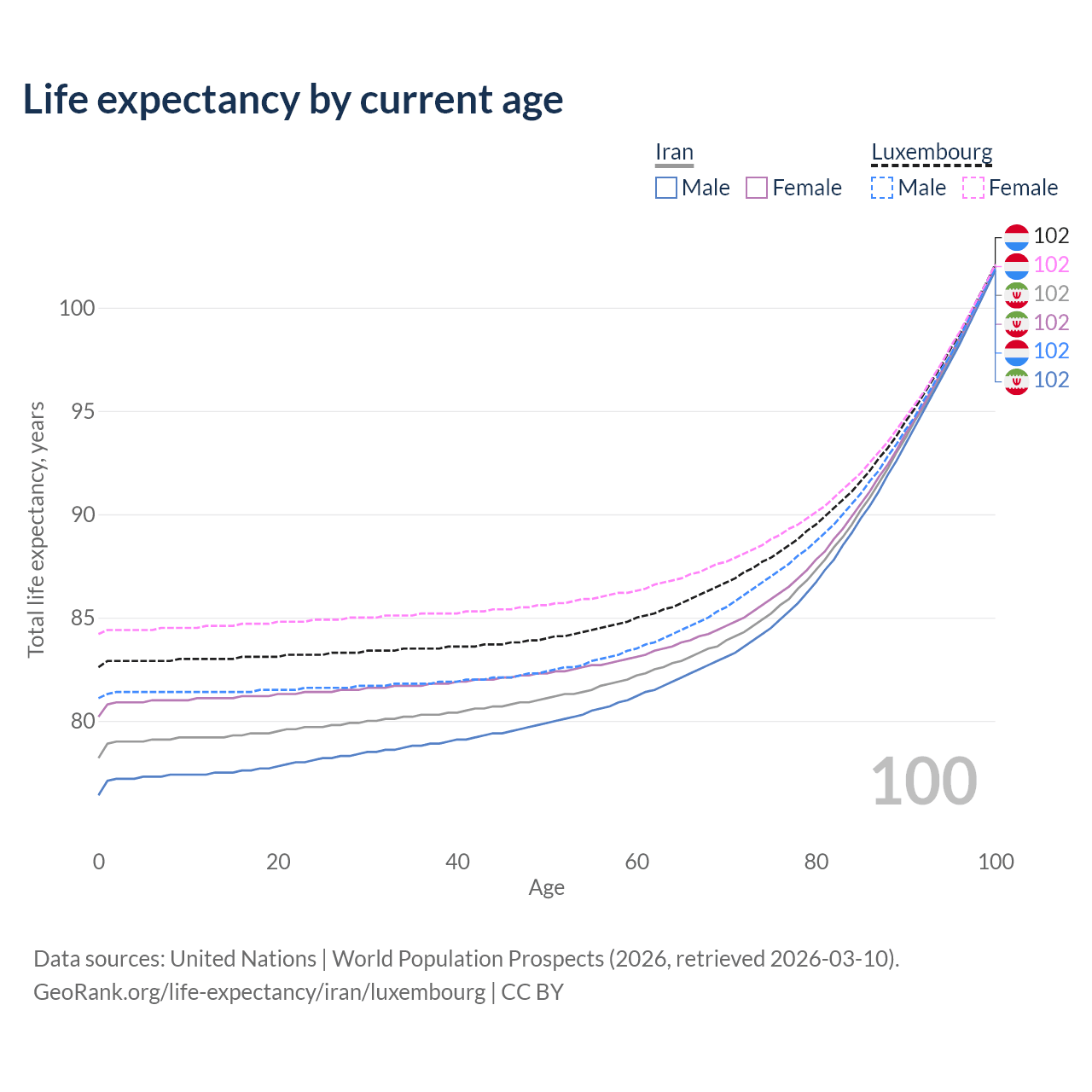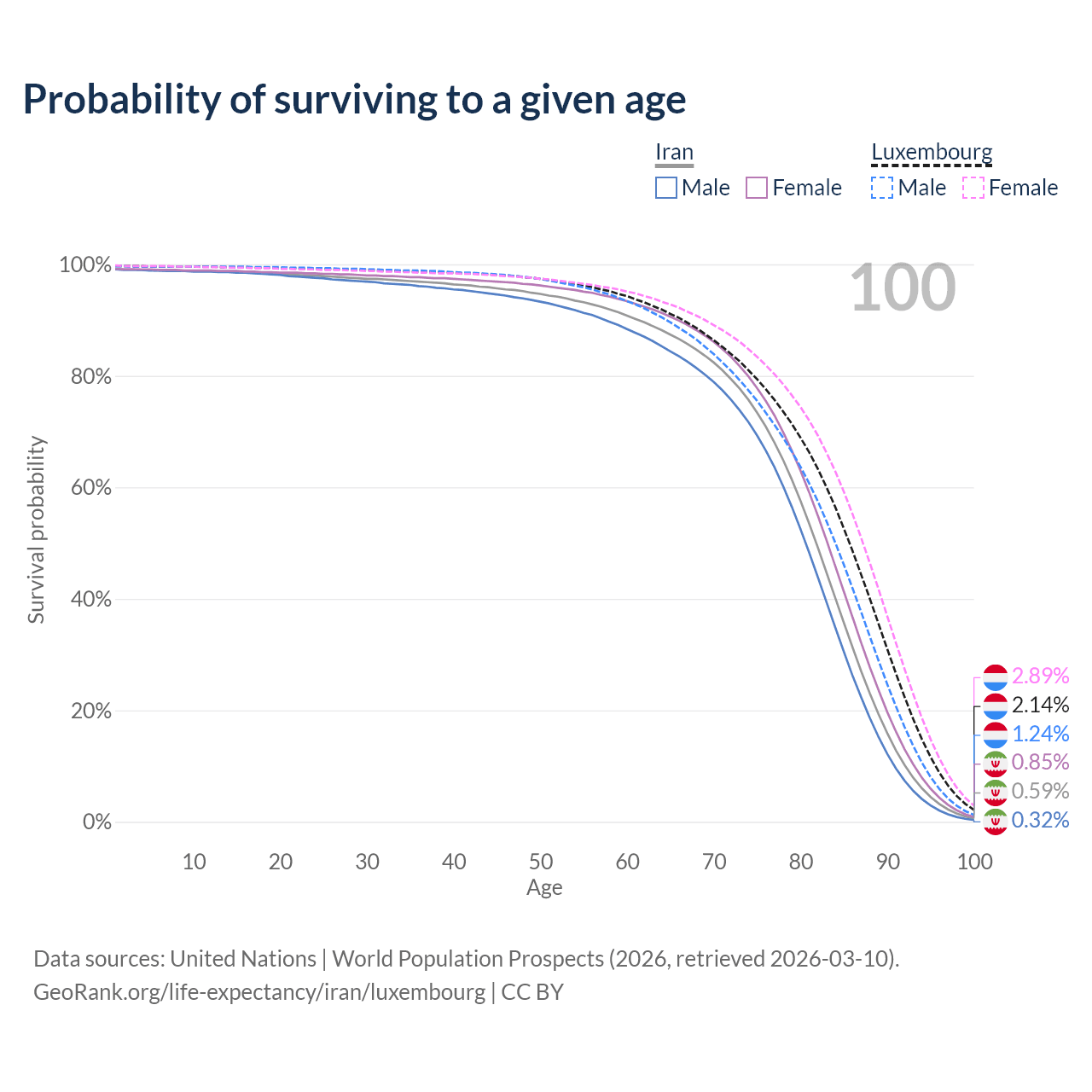 This life expectancy calculator shows the odds of living to 100, 95, 90, and below based on current age for both males and females in Iran and Luxembourg, along with mean and median age of death. The calculations are based on the 2026 life tables (actuarial tables) from the UN World Population Prospects.