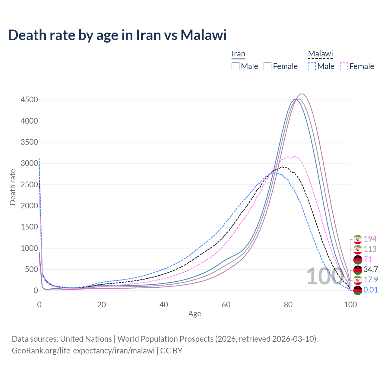 The average life expectancy at birth is 78.2 years in Iran vs 67.9 in Malawi. Iran is ranked 61/197 by life expectancy, and Malawi is 152/197. In Iran, the life expectancy is 76.4 years for males and 80.2 years for females. In Malawi, it's 64.6 years for males and 71.1 years for females.