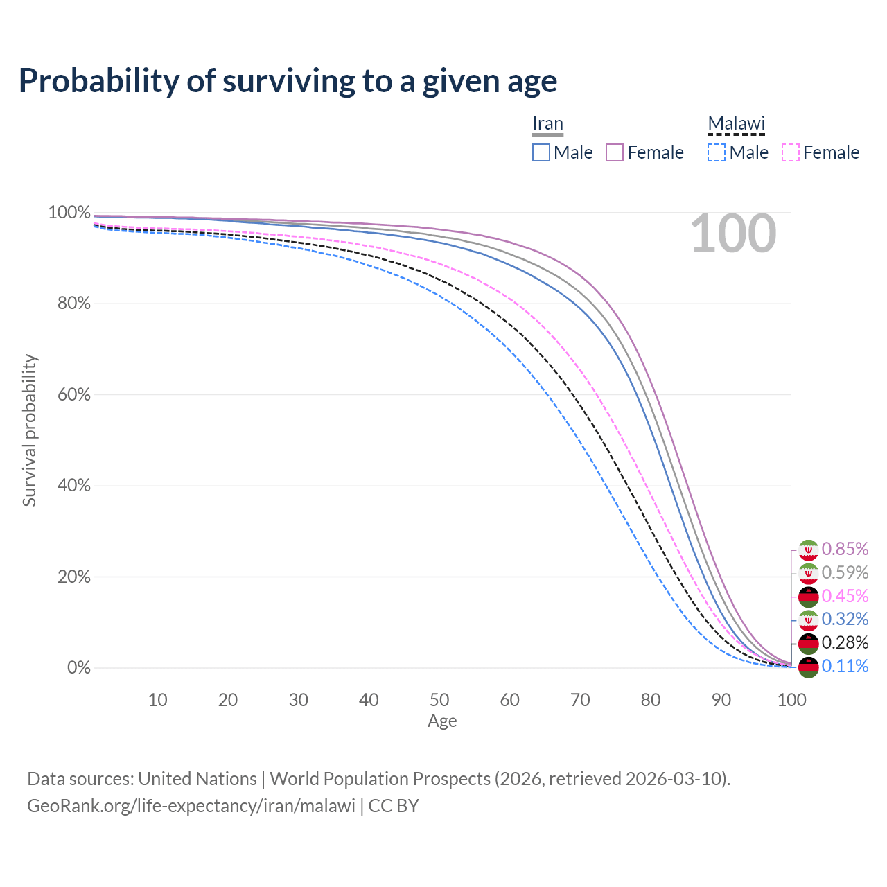 This life expectancy calculator shows the odds of living to 100, 95, 90, and below based on current age for both males and females in Iran and Malawi, along with mean and median age of death. The calculations are based on the 2026 life tables (actuarial tables) from the UN World Population Prospects.