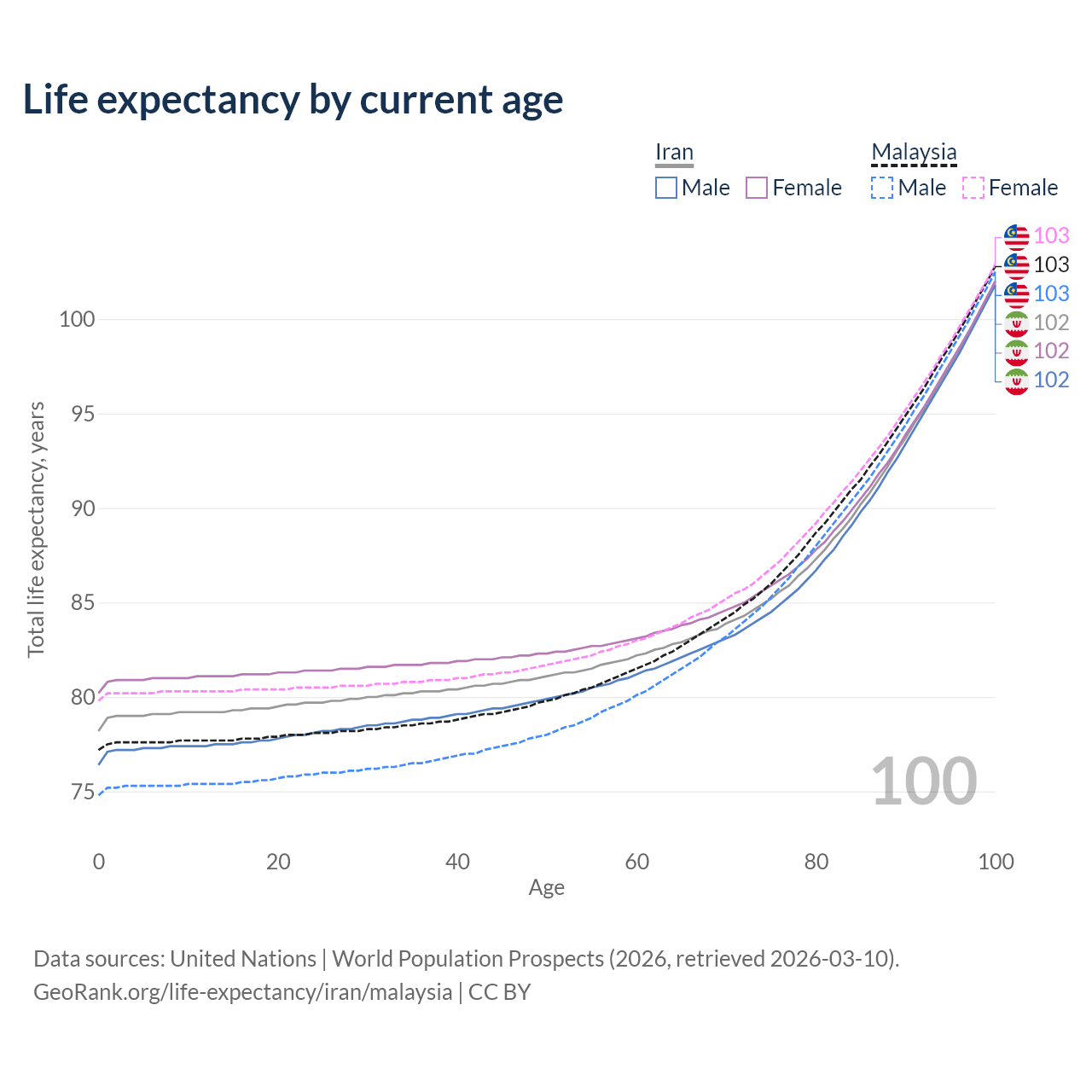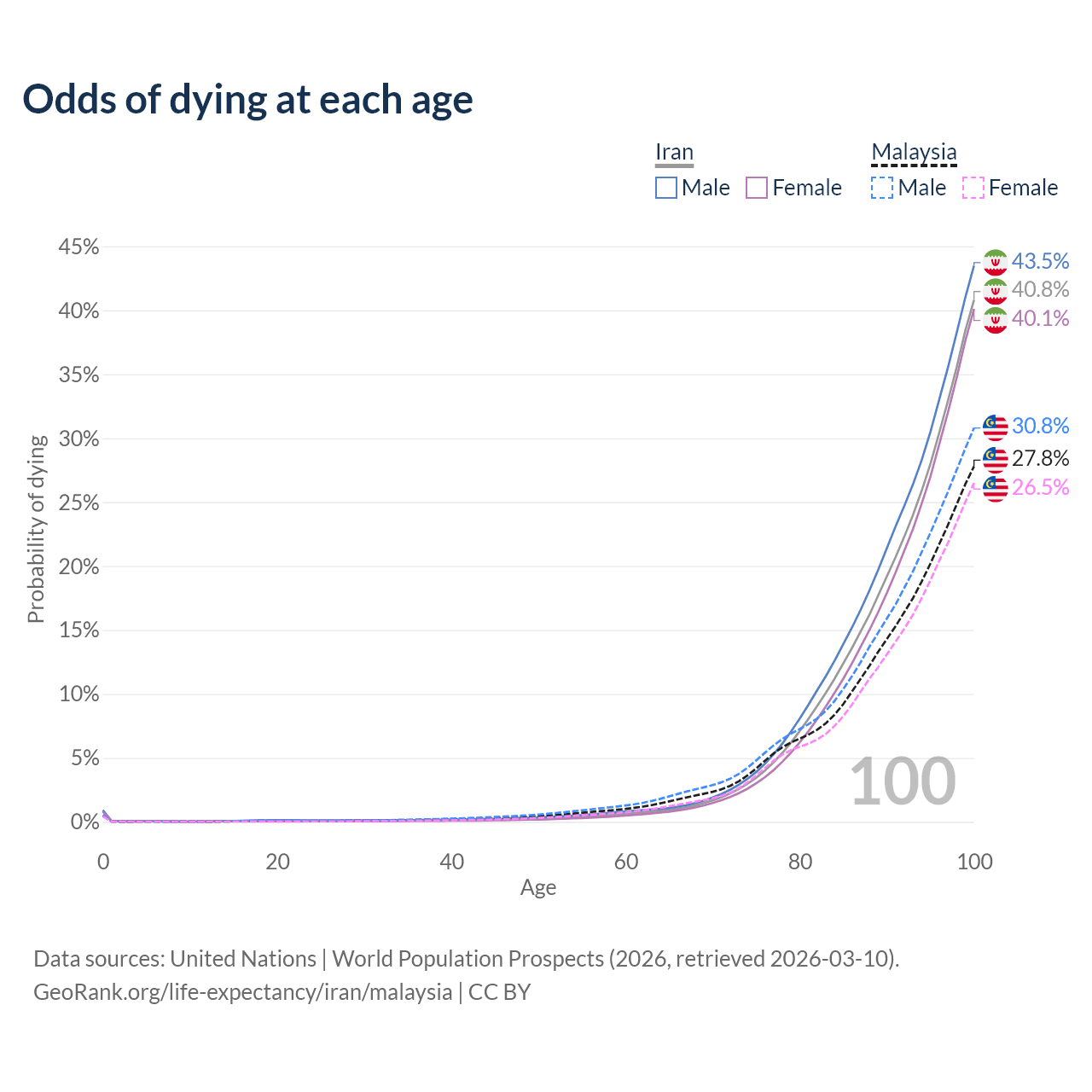This life expectancy calculator shows the odds of living to 100, 95, 90, and below based on current age for both males and females in Iran and Malaysia, along with mean and median age of death. The calculations are based on the 2026 life tables (actuarial tables) from the UN World Population Prospects.