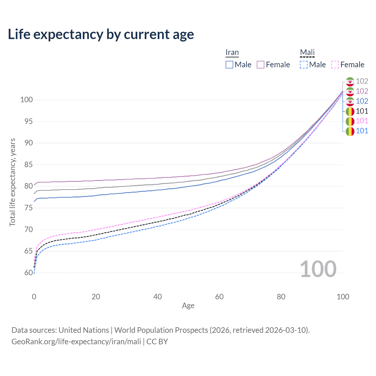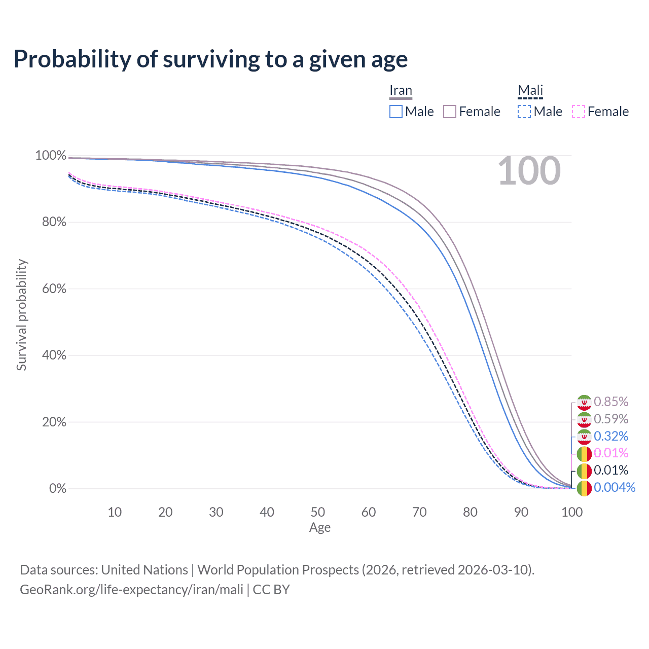 This life expectancy calculator shows the odds of living to 100, 95, 90, and below based on current age for both males and females in Iran and Mali, along with mean and median age of death. The calculations are based on the 2026 life tables (actuarial tables) from the UN World Population Prospects.