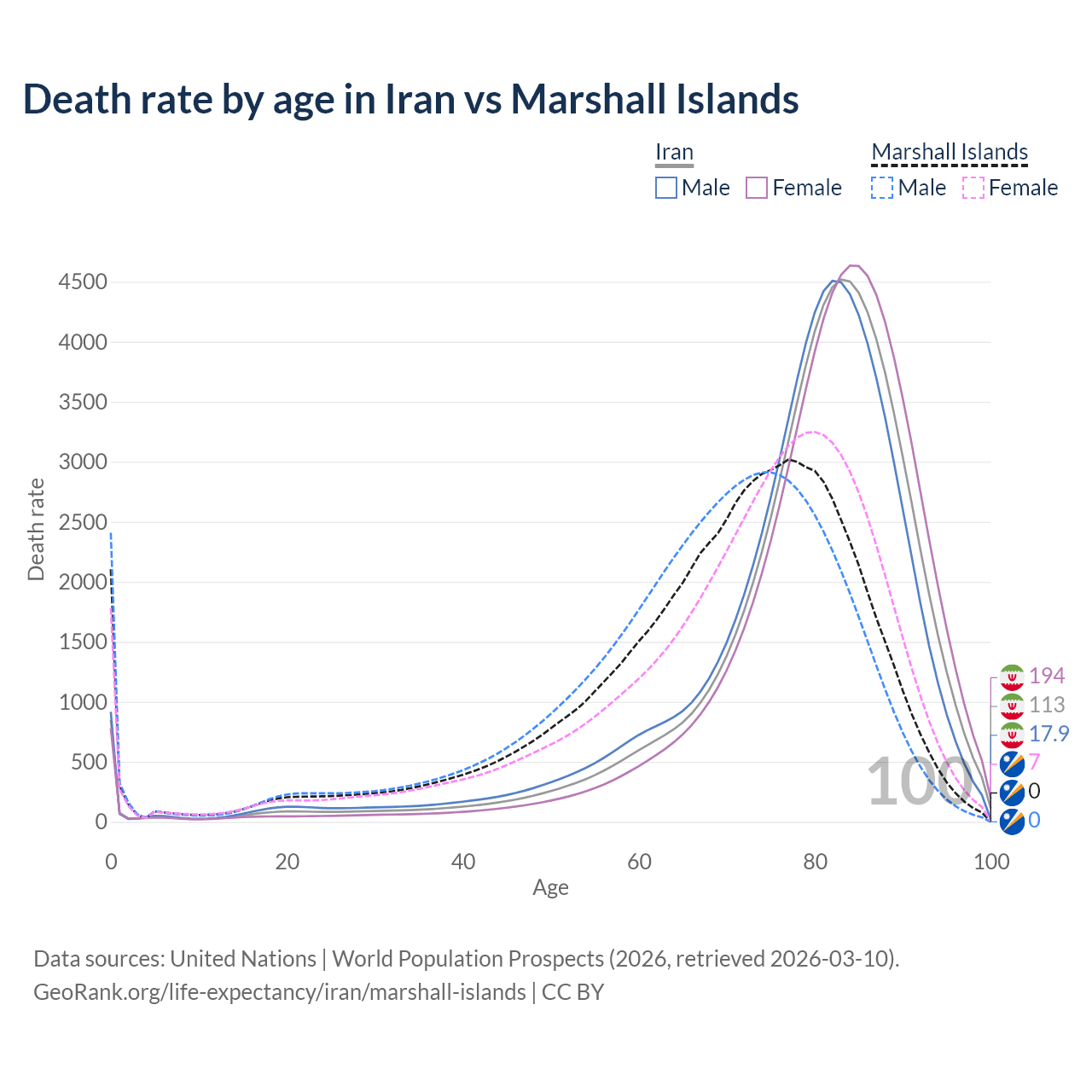 In Iran, the most common age of death is 83, compared to 77 in the Marshall Islands. The median age of death is 81.8 in Iran and 72 in the Marshall Islands, meaning only half of each cohort is expected to live past that age.