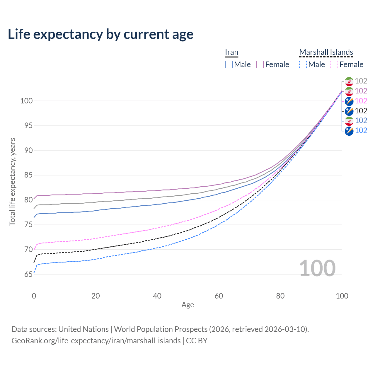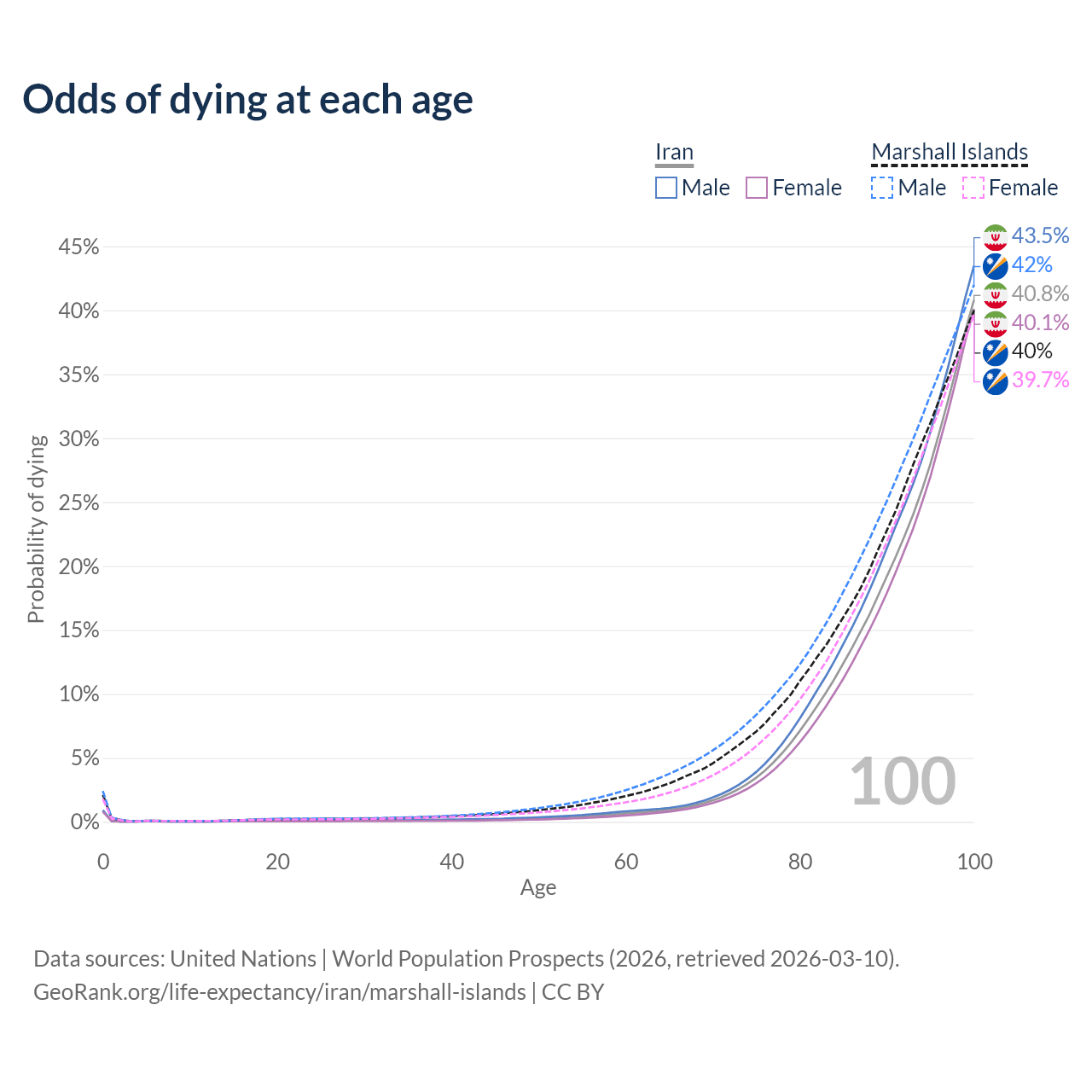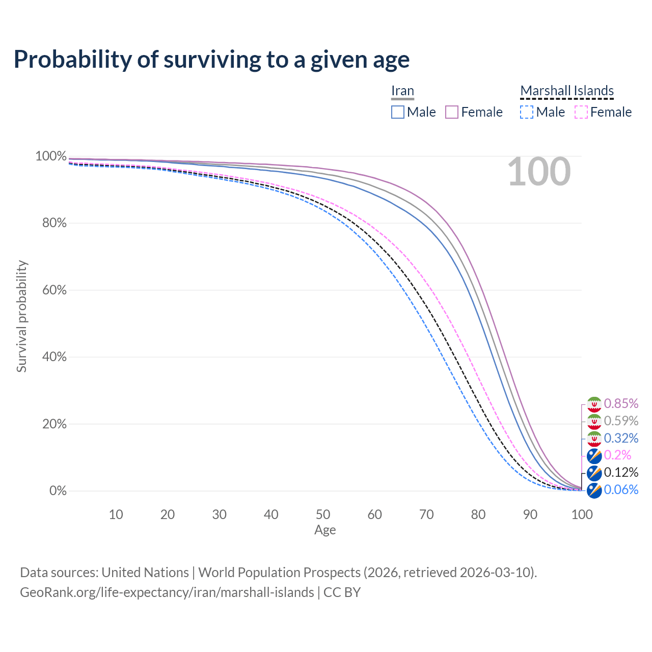 This life expectancy calculator shows the odds of living to 100, 95, 90, and below based on current age for both males and females in Iran and the Marshall Islands, along with mean and median age of death. The calculations are based on the 2026 life tables (actuarial tables) from the UN World Population Prospects.