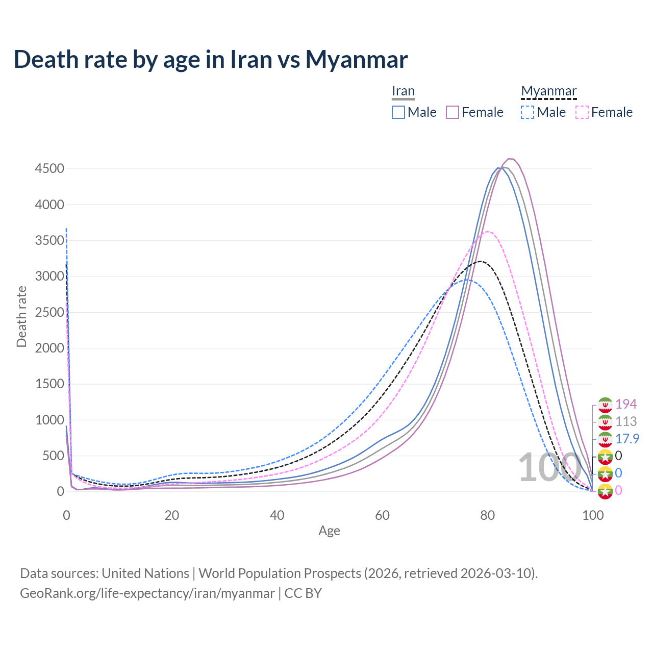 The average life expectancy at birth is 78.2 years in Iran vs 67.5 in Myanmar. Iran is ranked 61/197 by life expectancy, and Myanmar is 157/197. In Iran, the life expectancy is 76.4 years for males and 80.2 years for females. In Myanmar, it's 64.4 years for males and 70.8 years for females.