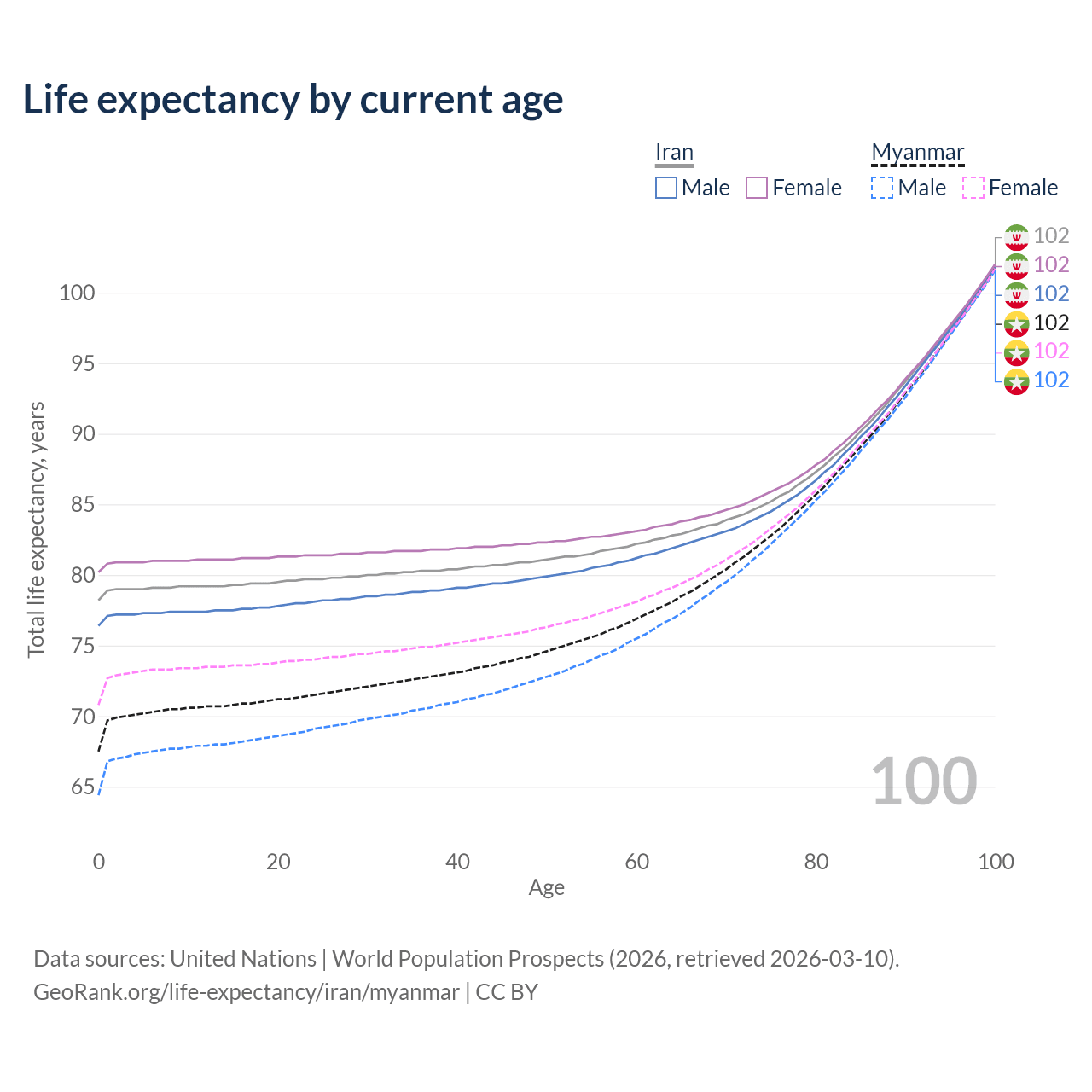 This life expectancy calculator shows the odds of living to 100, 95, 90, and below based on current age for both males and females in Iran and Myanmar, along with mean and median age of death. The calculations are based on the 2026 life tables (actuarial tables) from the UN World Population Prospects.