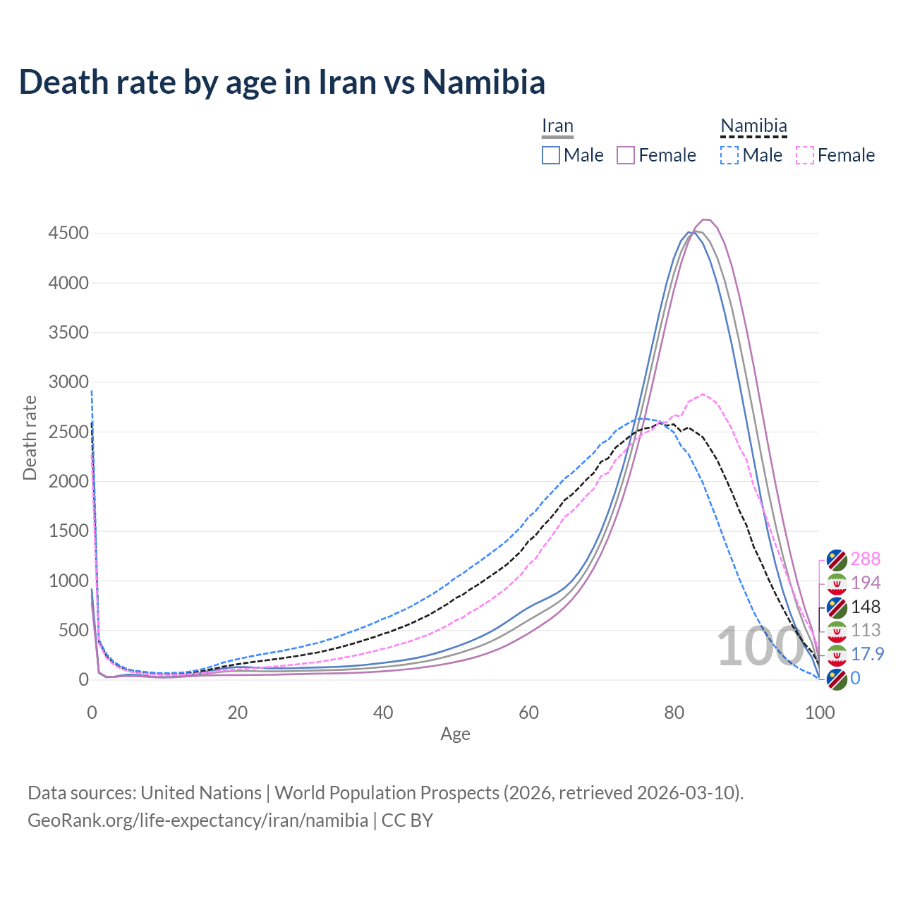 In Iran, the most common age of death is 83, compared to 0 in Namibia. The median age of death is 81.8 in Iran and 72.7 in Namibia, meaning only half of each cohort is expected to live past that age.