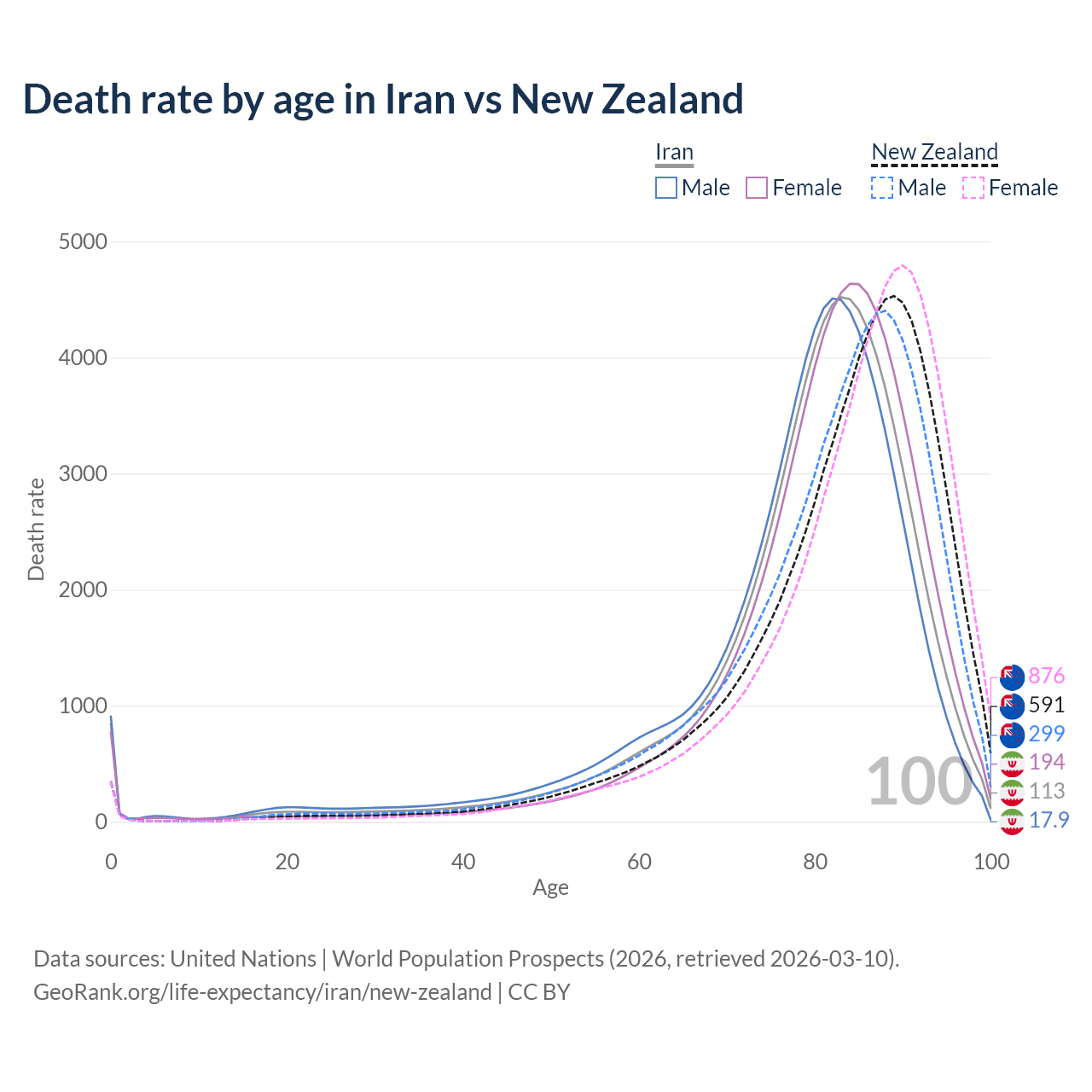 In Iran, the most common age of death is 83, compared to 89 in New Zealand. The median age of death is 81.8 in Iran and 85.8 in New Zealand, meaning only half of each cohort is expected to live past that age.