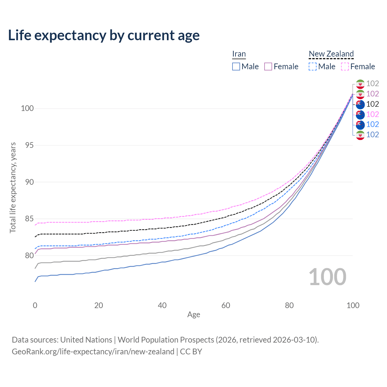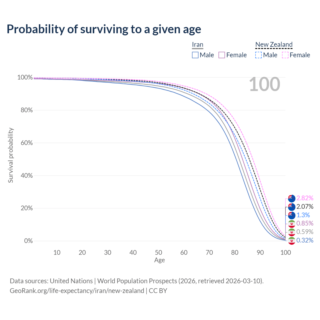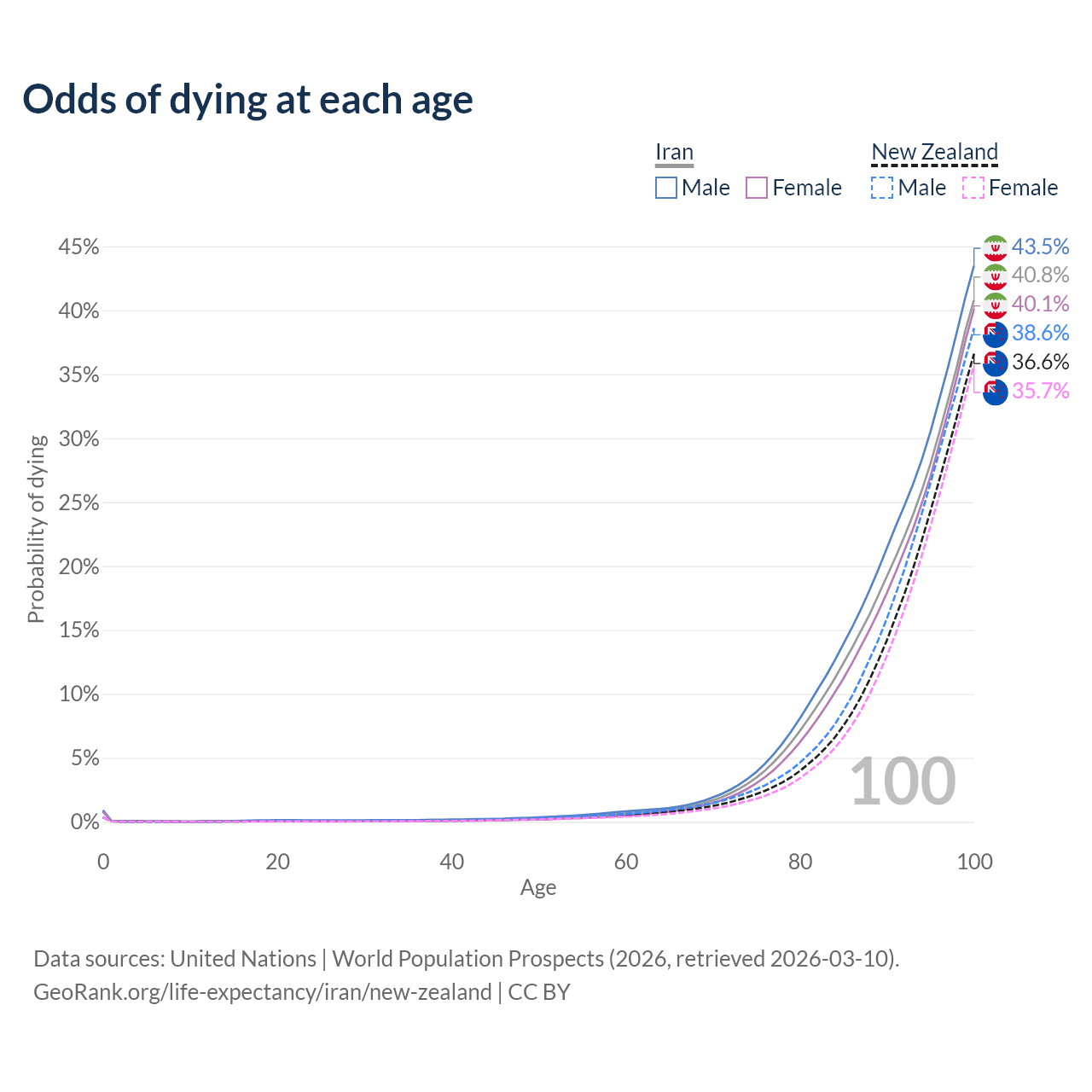 This life expectancy calculator shows the odds of living to 100, 95, 90, and below based on current age for both males and females in Iran and New Zealand, along with mean and median age of death. The calculations are based on the 2026 life tables (actuarial tables) from the UN World Population Prospects.