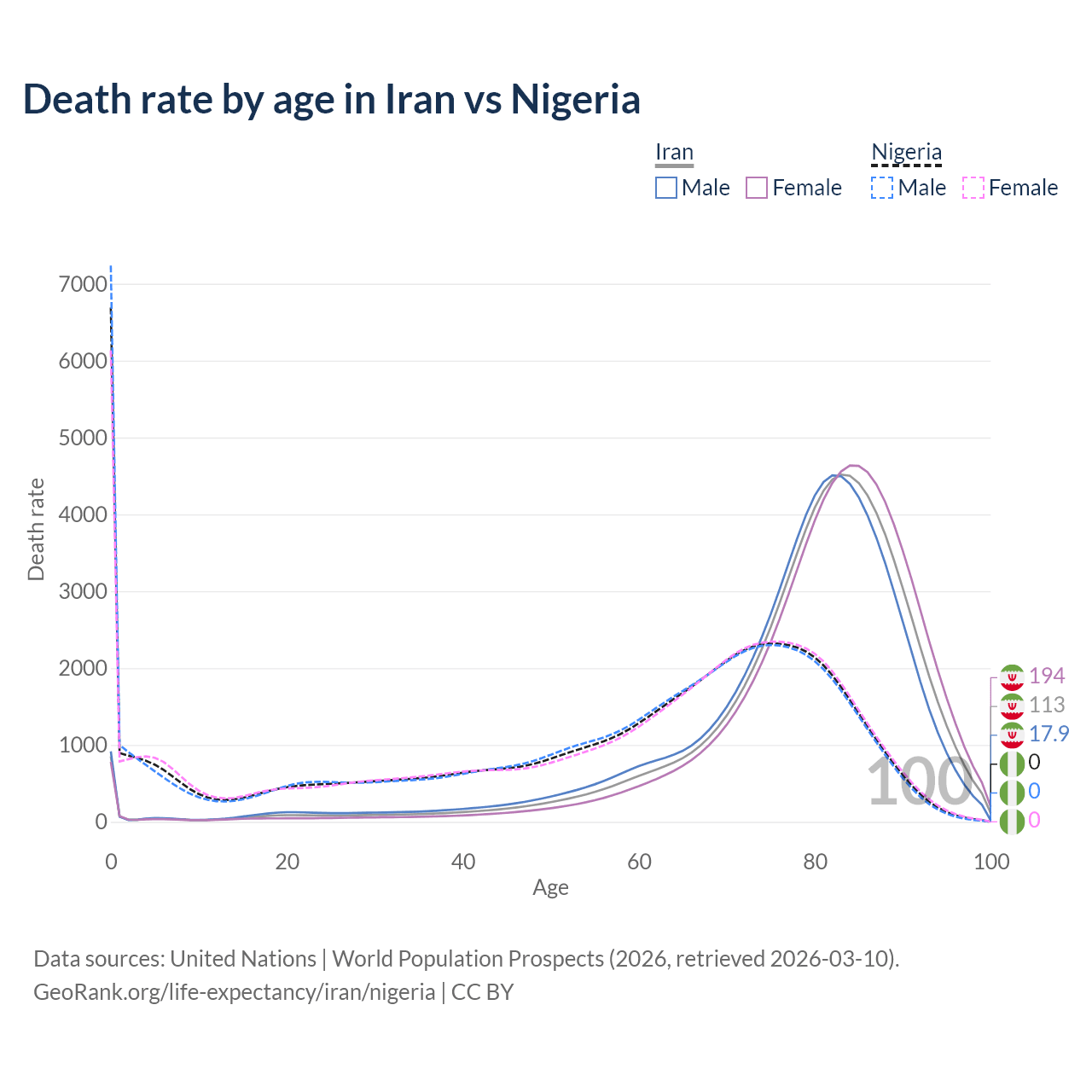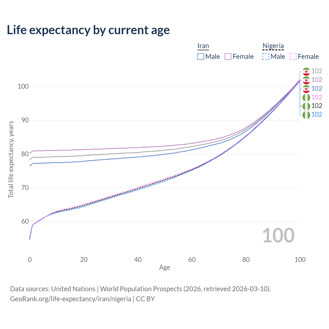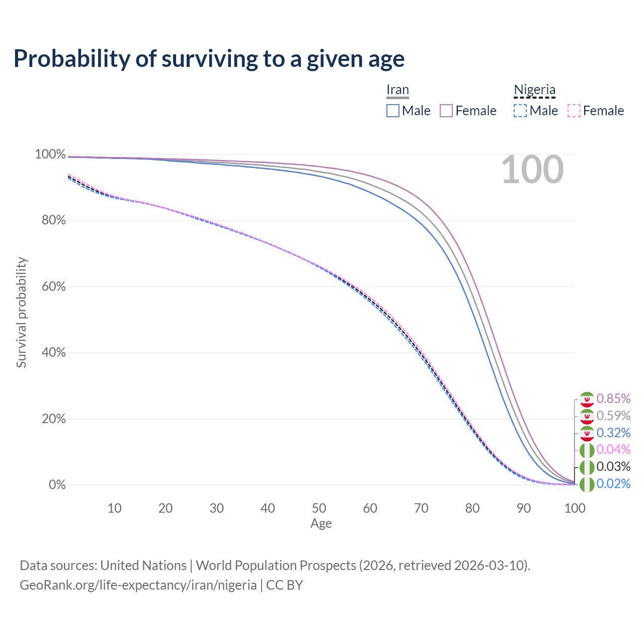This life expectancy calculator shows the odds of living to 100, 95, 90, and below based on current age for both males and females in Iran and Nigeria, along with mean and median age of death. The calculations are based on the 2026 life tables (actuarial tables) from the UN World Population Prospects.