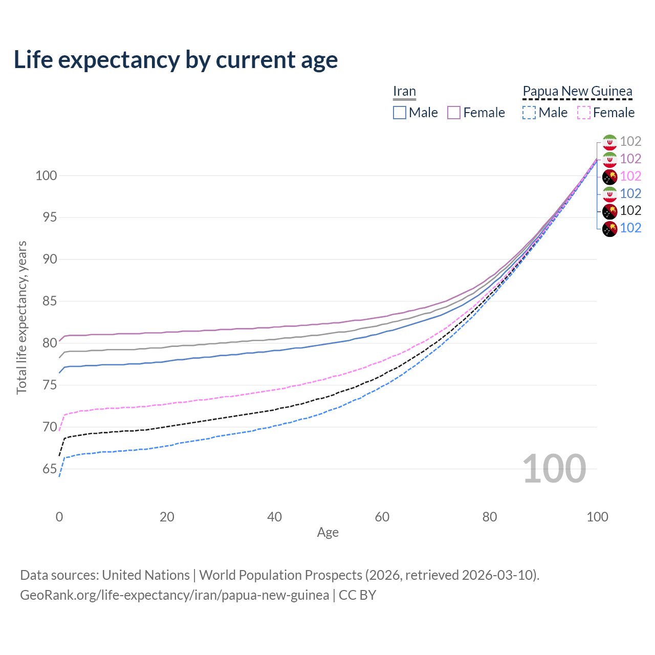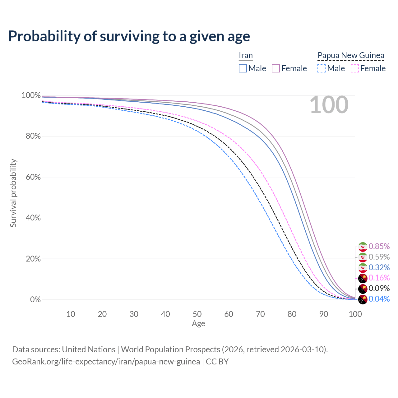 This life expectancy calculator shows the odds of living to 100, 95, 90, and below based on current age for both males and females in Iran and Papua New Guinea, along with mean and median age of death. The calculations are based on the 2026 life tables (actuarial tables) from the UN World Population Prospects.