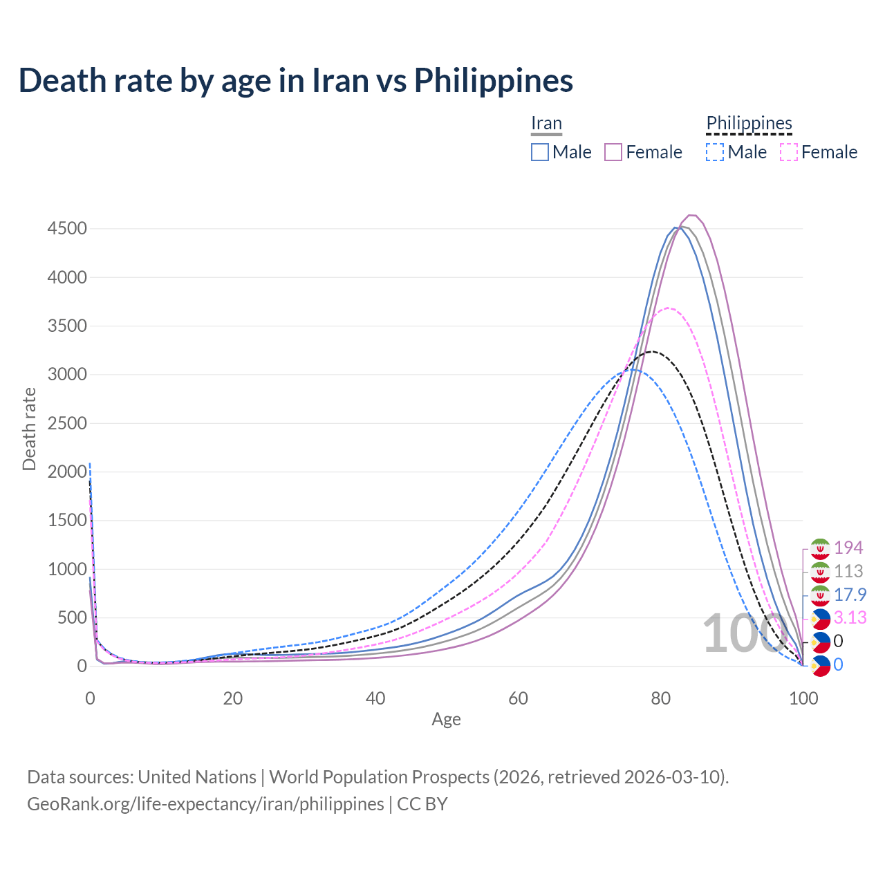 This life expectancy calculator shows the odds of living to 100, 95, 90, and below based on current age for both males and females in Iran and the Philippines, along with mean and median age of death. The calculations are based on the 2026 life tables (actuarial tables) from the UN World Population Prospects.