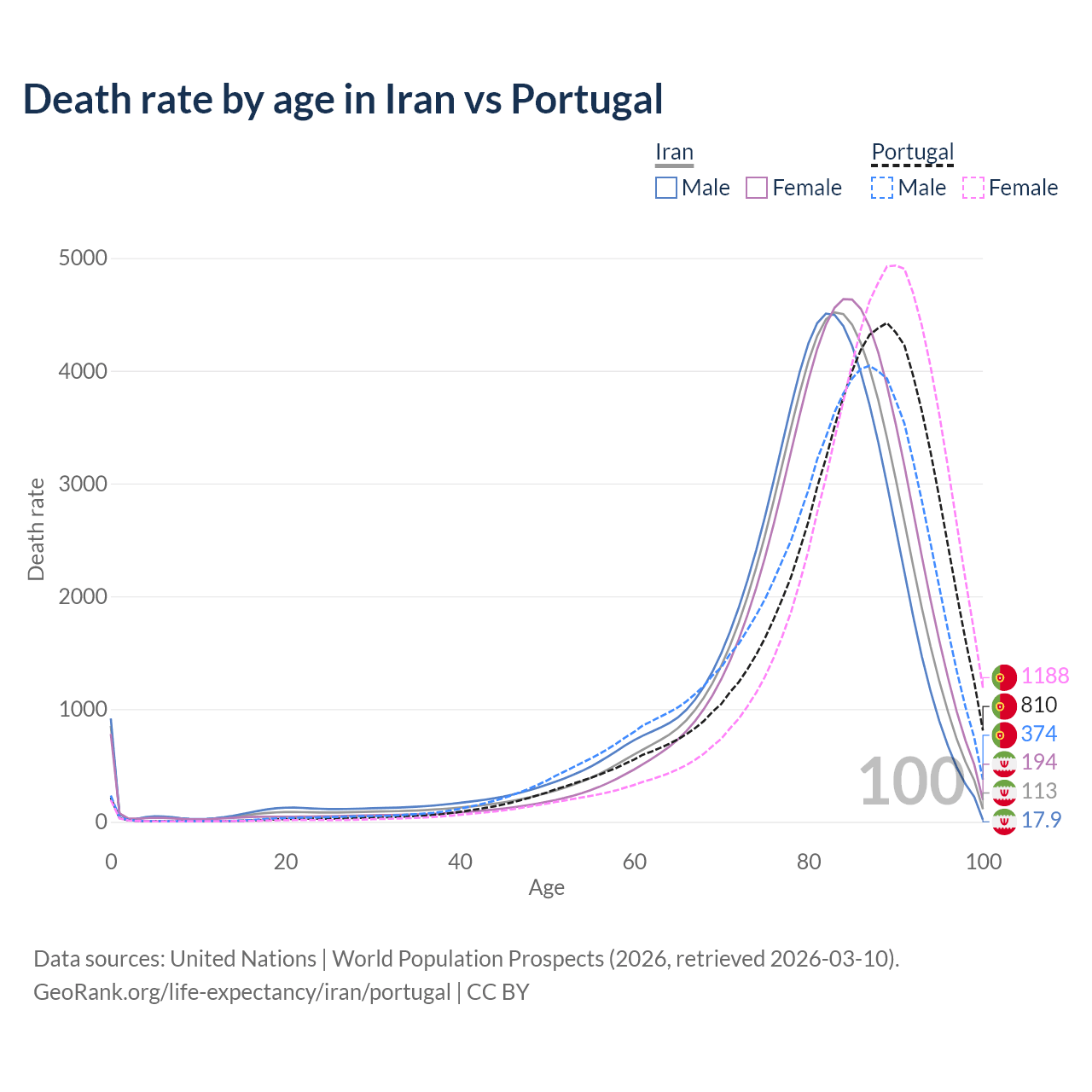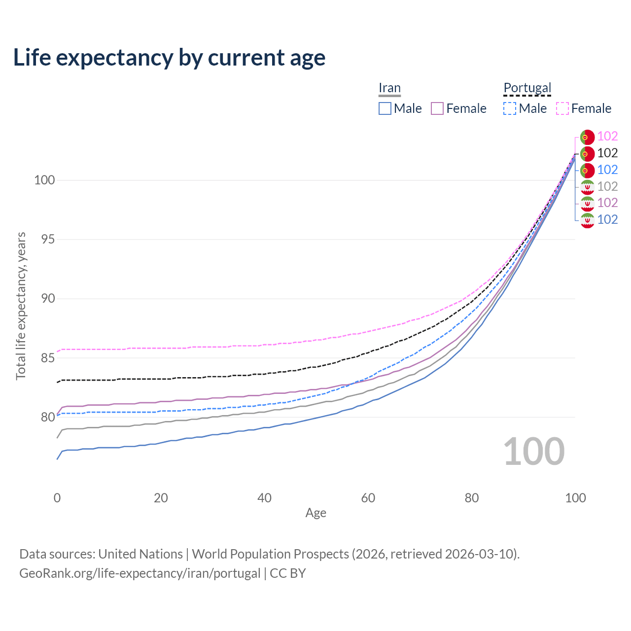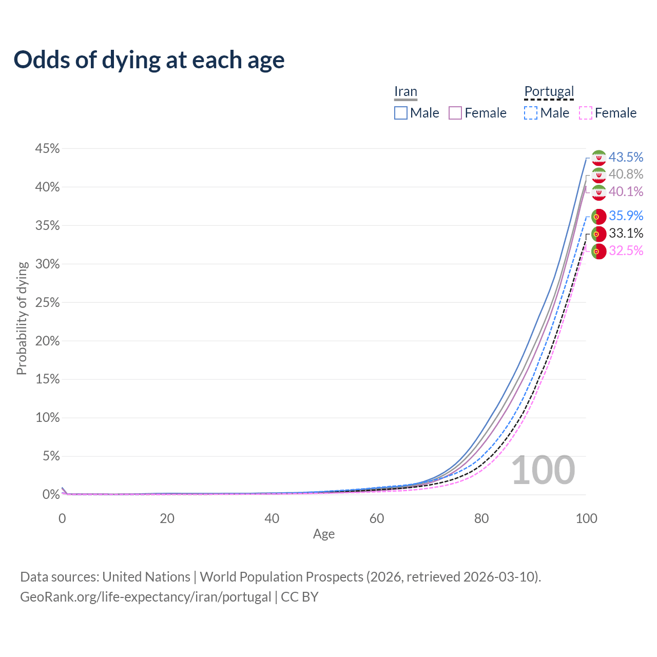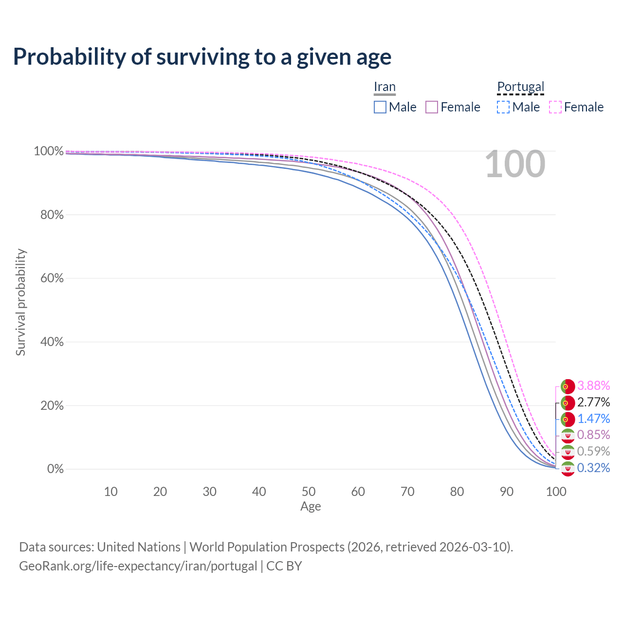 This life expectancy calculator shows the odds of living to 100, 95, 90, and below based on current age for both males and females in Iran and Portugal, along with mean and median age of death. The calculations are based on the 2026 life tables (actuarial tables) from the UN World Population Prospects.